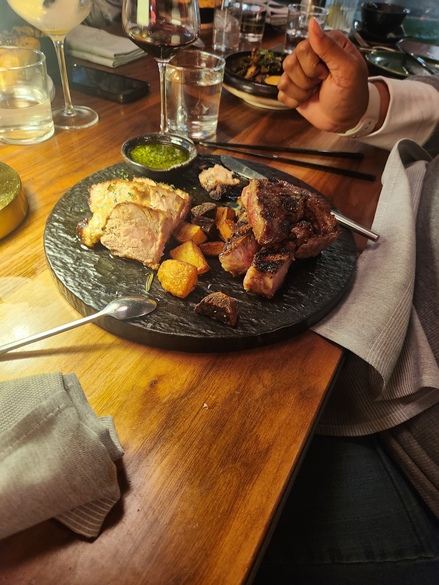 Read moreWe went as a group of 6. The tables are long for large groups which does make serving and sitting inaccessible and difficult. The service was wonderful. Mathias made jokes and kept things light. Drinks: Drinks pictured are a an old fashion and pink rose. The old fashion lacked flavor and color. The rose was golden lacking the pink tint and flavor. Food: The food was okay but also lacked certain components. The pork chop needed a bit more than butter as seasoning. While still a bit moist, chimichurri is not the only topping needed. rib eye (we got cooked medium well) was the best part of the meal with bold flavors. The bone was charred and tasted burnt. Yucca fries- overcooked and bland