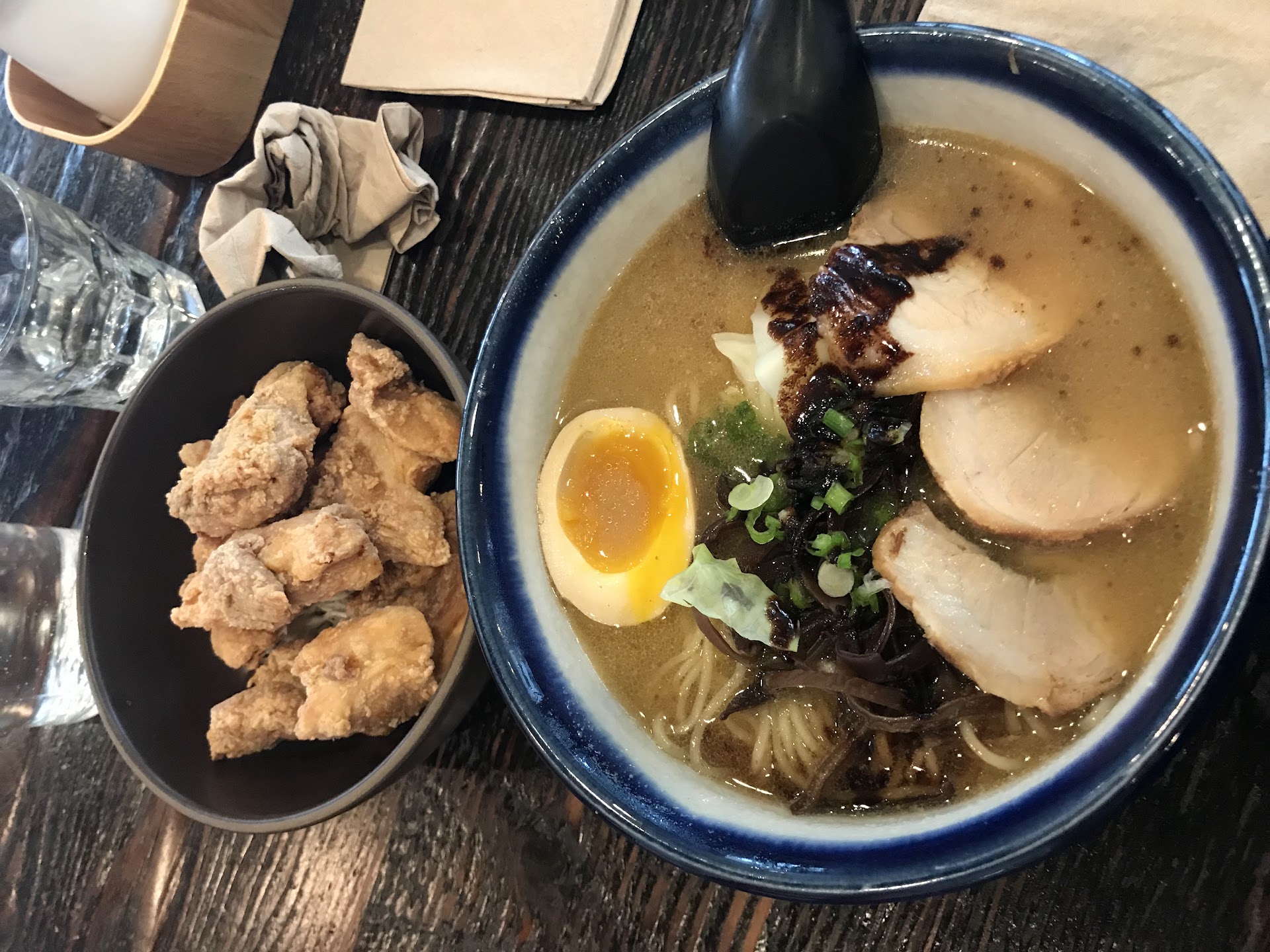 I've been eyeing this place for awhile, ever since it opened up and saw it on ScoutMob. Initially wanted to go to Umami Burger, but when we found out that it was closed during the holiday season, the bf and I decided to come here to give it a try. Called the place ahead of time to see how long of a wait it will be, and to find out that there's no wait at all. One annoying thing is that it's cash only, so we had to stop by an ATM to pull out cash. I don't think there's a store sign, so it was hard to locate the ramen house. When we arrived, there were only two tables being occupied. The owner (I believe) told us that only the tonkatsu broth was the only choice left, but that wasn't a problem because it's my go-to broth anyways! The chicken karaage was alright - it was a bit oily, but had nice flavor to it.