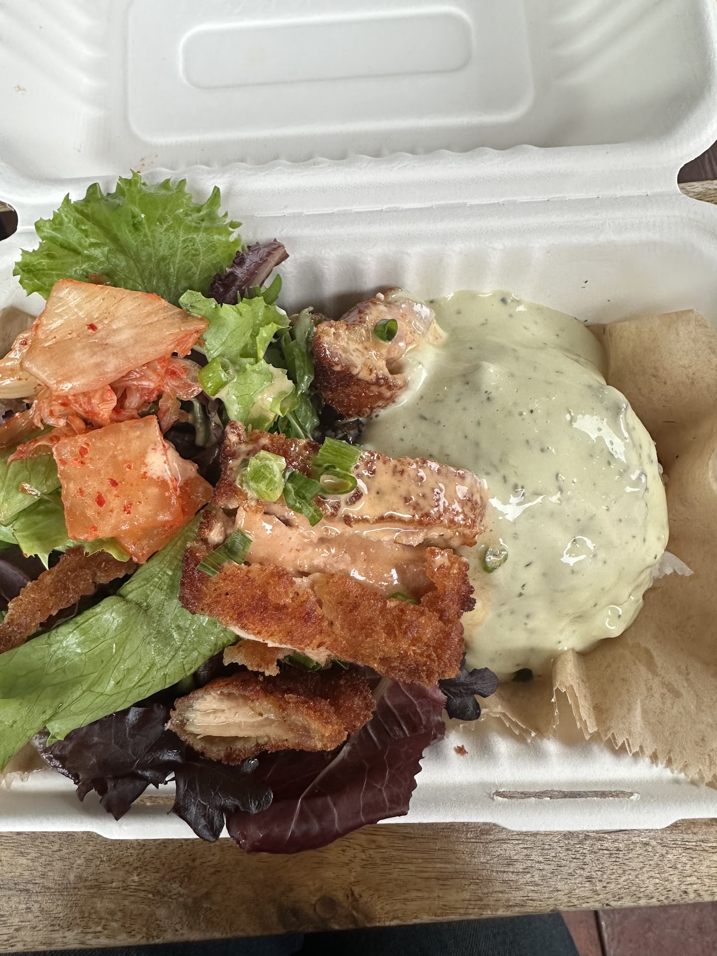 The chicken is really really small and the rest of the meal is just rice and salad. There’s no dressing on the salad so it’s pretty dry. They gave so little kimchi and it also tasted bland (there’s no kimchi kick to it iykyk)