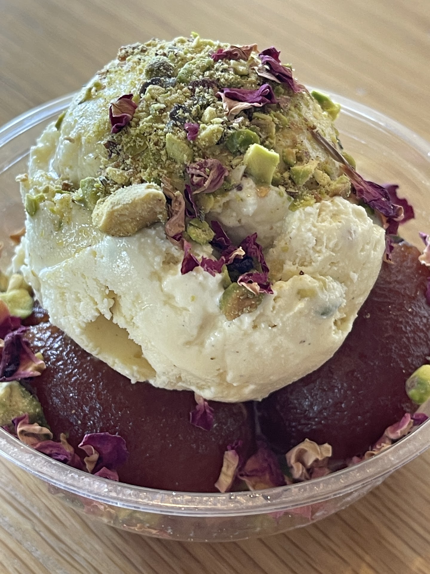 The gulab jamun sundae consists of two warm, fried balls of dough drenched in a sweet syrup with one scoop of your choice of ice cream on top. This was my favorite! I have had gulab jamun before and always think it pairs well with cold ice cream on top, and I really like the Klassic Koolfi flavor, which had pistachios, walnuts, cardamom, rose water, and saffron.