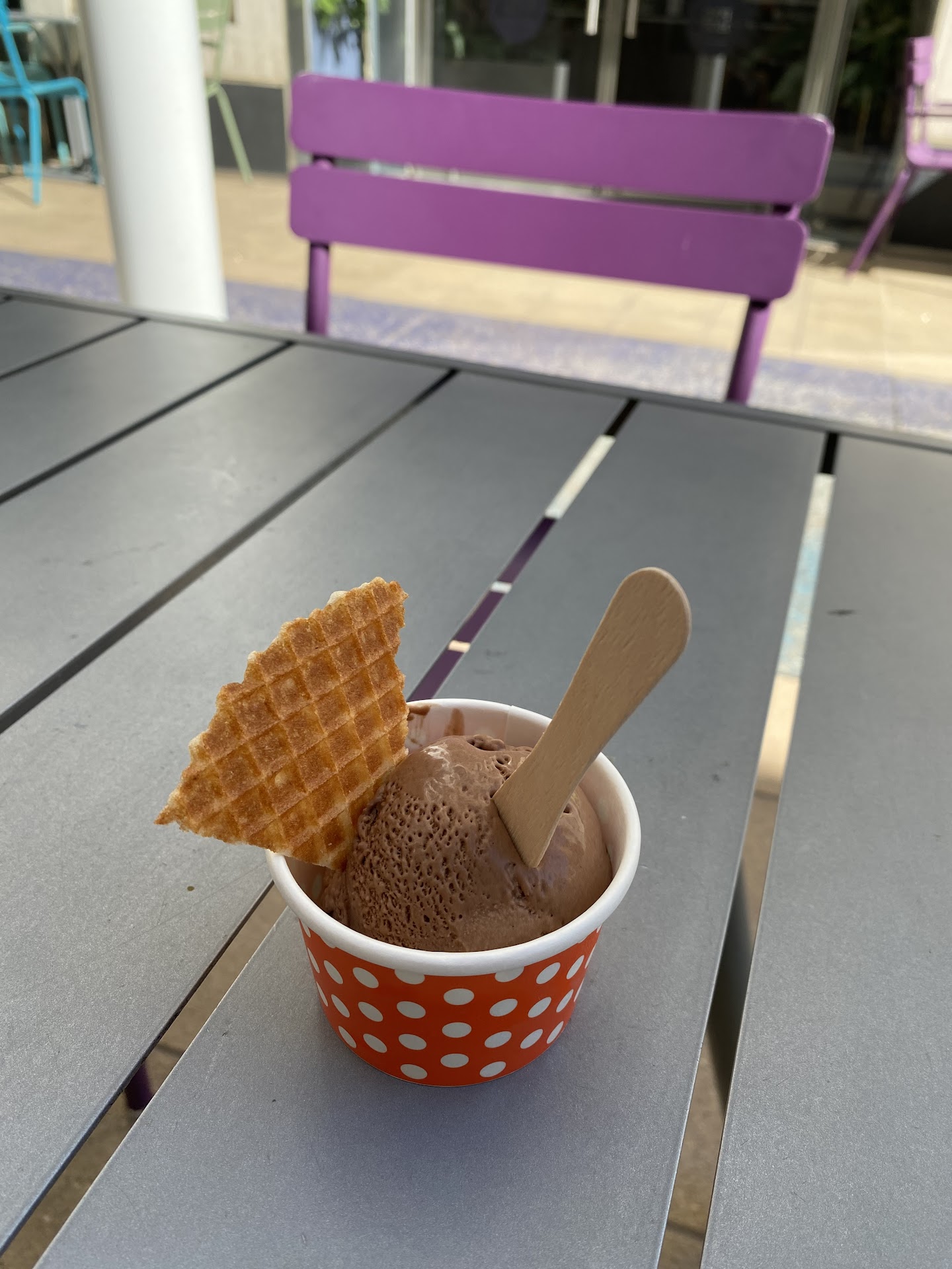 Read moreKoolfi makes an amazing vegan chocolate ice cream! I'm lactose intolerant and love chocolate so I've tried every ice cream shop's vegan chocolate and Koolfi's is one of the best. It's made with coconut milk but does not taste like coconut, there's plenty of cocoa flavor. The ice cream was the perfect smooth, creamy texture and not ice-y at all. I tried a sample of the Guava with a hint of red Chile which was fruity and tasty though I didn't detect any spice in my small sample. The kind employee was friendly, helpful and knowledgeable about all of the menu items. They added a piece of the dosa cone to my ice cream so I could taste it - would be a nice lentil-y background flavor when paired with any ice cream. Excited to try more sorbet flavors and a savory treat and support this queer and woman-owned business. This ice cream spot is a bit hidden away and while there's no seating in the store there's plenty of tables and chairs outside and free wifi - the perfect place to relax...