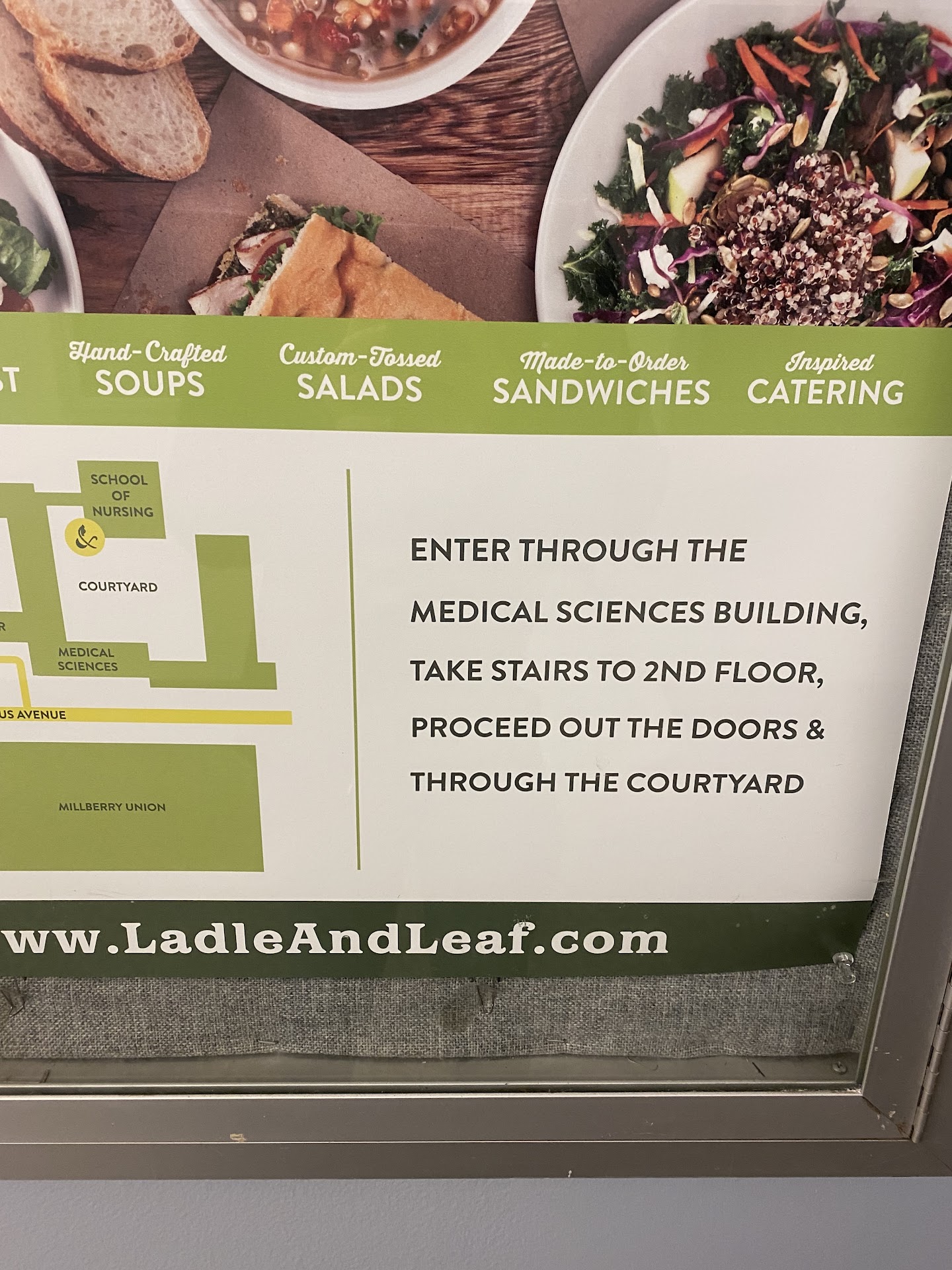 I eventually found one sign in a hallway that tells you how to get there, otherwise I would have had to call the cafe to find it. Got two vegetarian sandwiches and they were pretty good but probably not worth the time it took to get them. Would recommend if you are at/around...