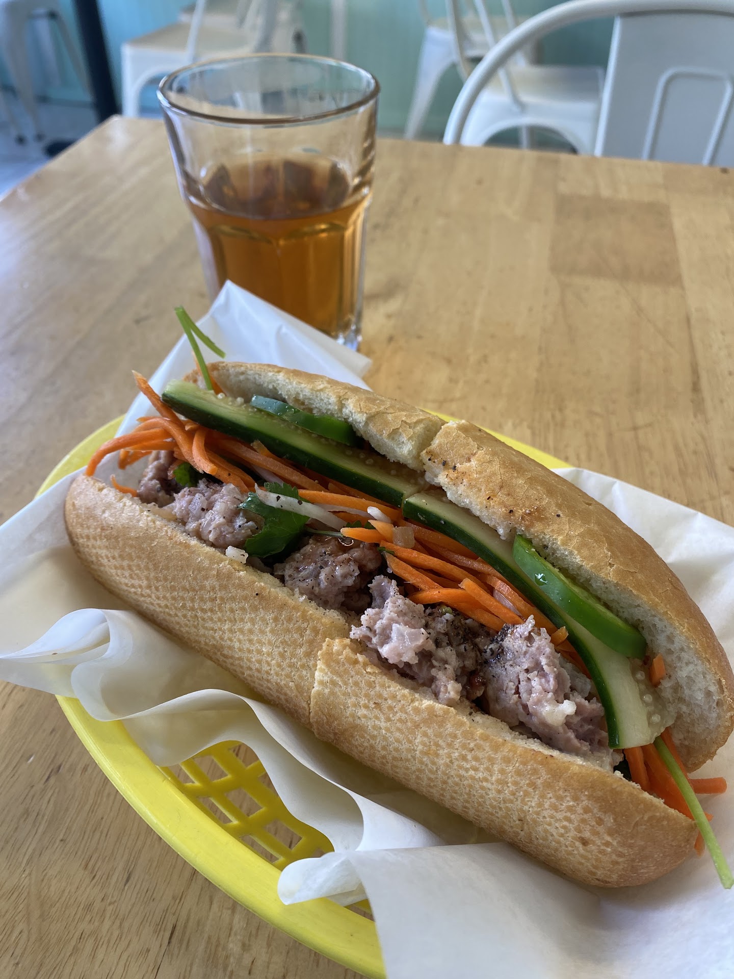 A brightly colored cafe tucked away from the griminess of Hyde st. With a handful of tables it's cozy spot to dine in or also takeaway. The owner is the sweetest and you get a real sense of community here. Their banh mi are light and fresh - a focus on flavor rather than quantity. They also somehow have a supply of Vietnamese coriander which I've personally never seen offered elsewhere, it's rare to find. My two recommendations would be to get their fish cake and their sweet pork meatball sandwiches. The owner has made all the banh mi I've ever gotten from there and she genuinely has an eye for detail. You can't go wrong with anything here. They've also got a phenomenal, and small, noodle soup menu. And grab a $2 bean or corn pudding while you're at it. And a...