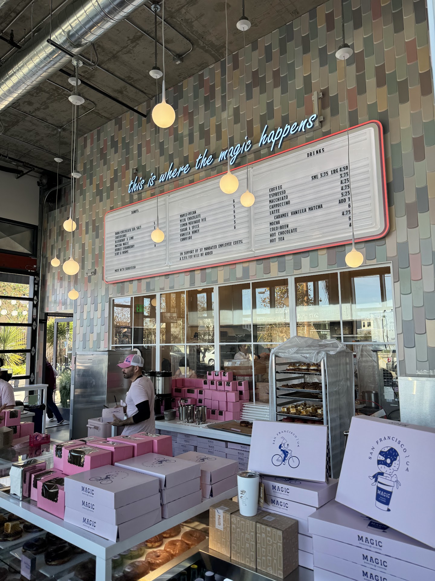 Read moreI had high hopes for this place but unfortunately it did not live up to the hype. Magic Donuts offers a wide variety of sourdough donuts and they have a lot of unique flavors. We ended up trying what they suggested: the dark chocolate sea salt and the vanilla. The texture of the donuts are definitely different than your traditional mom & pop donut shop but still pretty solid nonetheless. However, the vanilla donut was lacking vanilla flavor and just tasted like sweet bread in all honesty. The dark chocolate sea salt was better in my opinion as it had more flavor and was more enjoyable. The chocolate was definitely pretty dark, probably something in the 65%+ range, but the sweetness from the donut and the salt really helped balance it all out. We also tried their coffee (beans are from Roast Co. in Oakland, which we love) which I really wanted to like but it just tasted burnt and the milk was not frothed correctly unfortunately. I will say that the ambiance and vibe inside and around the shop are great and I would come with friends and family if we’re in the area. However, I wouldn’t go out of my way to come here but will definitely give them another shot in...