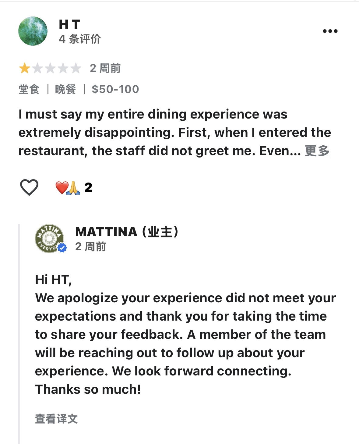 It is clear that the response left on my Google review was merely for show, and it is equally obvious that the restaurant’s management has chosen to ignore my email entirely. This further proves that MATTINA is an arrogant establishment with blatant discrimination against Asians.