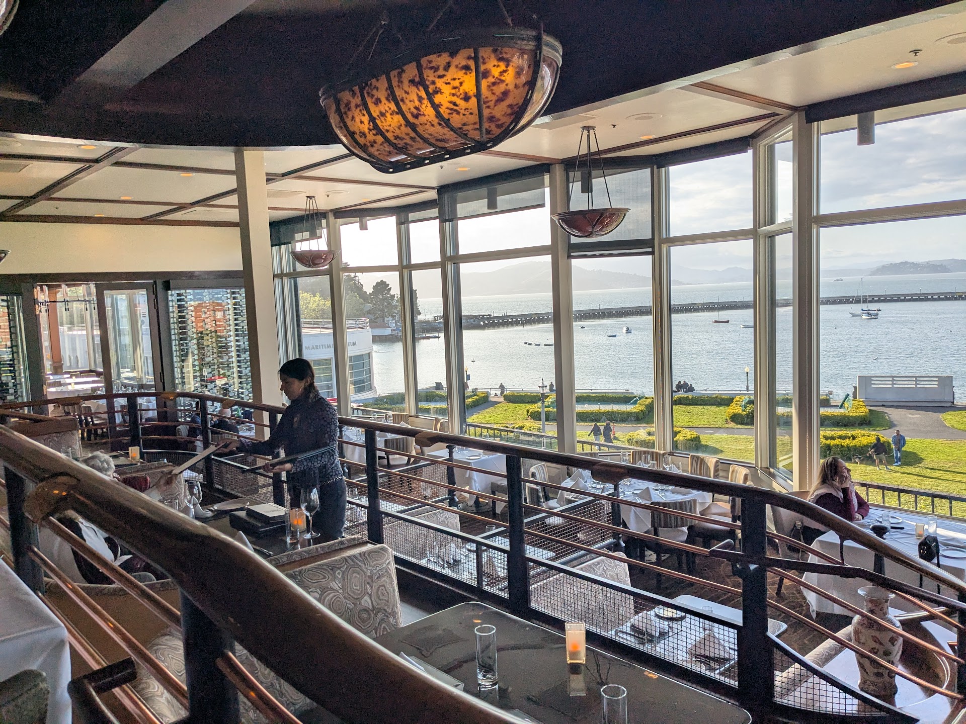 Read moreOutstanding! My family and I decided to go here for my girlfriend's birthday dinner. I placed the reservation with no problems on Open Table, even for being a peek time of 6:30pm. I called in and let them know we were celebrating a birthday, and also requested a view of the bay. Both requests were accommodated perfectly, even went above and beyond by customizing the menu with the header of "Happy Birthday Katherine" and the date! I couldn't tell you how special this made her feel to see this, and even better they rolled up our menus, put a bow on them, and presented them to us at the end to take home. My girlfriend ordered their 7oz Filet Mignon and of course added the Oscar style and garlic mashed potatoes to accompany her steak. She absolutely loved it! From her words of "melt in my mouth filet" and "delicious crab," she was in heaven with her meal. Prior to her meal, we split a wedge salad, which even when split was still a great portion and beautiful presentation. For my meal, I am more of a rib-eye lover, so was a little bummed to see a top sirloin or porterhouse as my alternatives. However this restaurant is know for its sea food so I was not too bummed, especially when the top sirloin came out perfectly with still some tenderness and good flavor. Plus to accompany the steaks they garnish the plate with some great grilled vegetables. My other family members ordered the pan seared scallops and then the sea scallop and shrimp Newberg. Both of them loved their seafood dishes and were happy with the size of the scallops as well. Then to top it off, our waiter, Glen, brought out a delicious cake with ice cream and a lit candle for us to sing a little birthday song for her. All in all, the food was outstanding and the service was very professional and on point, even with the manager stopping by and asking for drink refills after delivering the meal (did not catch her name). Next visit into San Francisco we will make sure to plan a meal at this beautiful restaurant and enjoy the view of the bay...