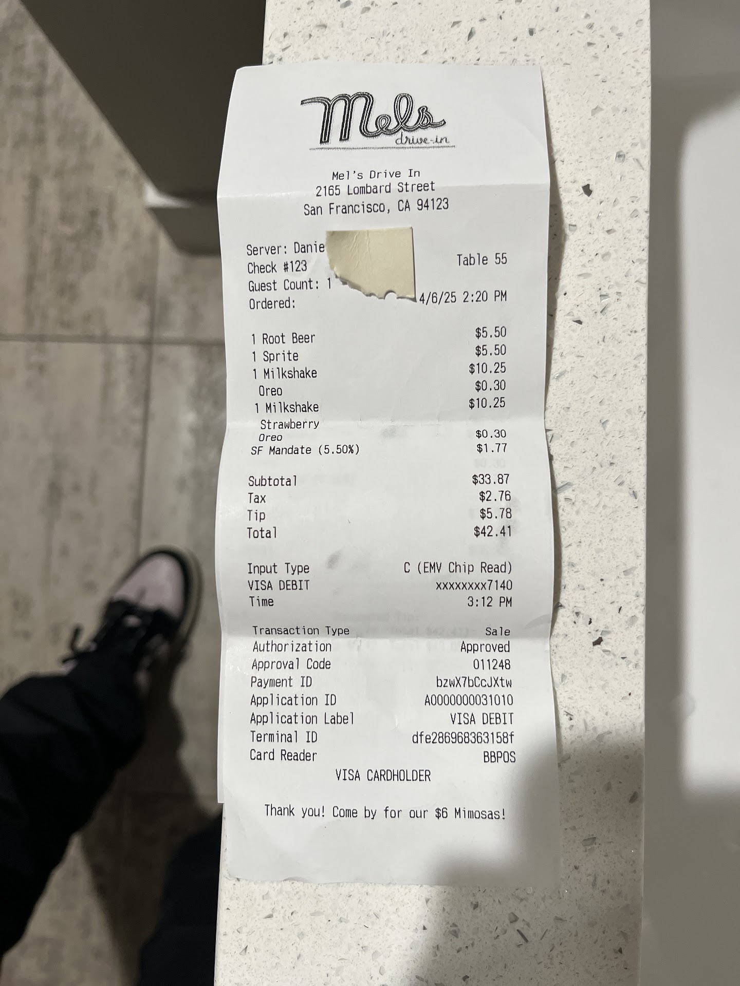 The good: the milkshakes were awesome. The bad: ordered a Burger for my girlfriend. We had asked for a burger with bacon and avocado, lettuce all that. What we had received was a Grey, meatloaf looking patty(dry, no oil) that was stacked on another patty, that were not even in sellable form. We’re talking “let me rip up a patty and feed it to my baby.” Yeah. A third of a patty here, and 1/4 there, you get the idea. Not to mention it was dry, flavorless, and simply not edible. Disgusting is what it was. And there was no bacon or avocado. Strange. What’s the point of even offering table service?? When I mentioned this all to our server, Danny, he said “ok, give us a chance to make it right.” Understandable. But where’s the customer support!? I felt like I was being annoying or unreasonable… a “Karen.” When instead, my concerns should have been treated with respect and acknowledgement at the very least. It wasn’t like I was trying to get my food for free. With that said, I figured it’s best they don’t remake the burger. The shakes were fine enough and we just wanted to relax and chat over a dinner table. I Quickly made that known, to our server. Also, I noticed that the security guard began to pace by the door(near my table) Perhaps they thought I wasn’t going to pay because of my appearance? I am a young skater/pothead so they probably assume the worst. Also, I noticed the owner/manager, who had a name tag that said “boss man” and he was mean mugging me!!! Giving me these eyes that were anything but welcoming. Why would you mean mug your customers?? That is the exact message he was portraying to me without saying a word. Body language is 95% of communication anyway! With that said, I had decided to get up, and ask him for the bill. I wanted to end any distrust, or assumptions that they might have had. After all, I just want to enjoy our milkshakes and relax over a dinner table. I noticed that the boss man didn’t seem to care about my situation. He didn’t ask how he can make it right, he didn’t ask anything nor did he apologize. He did remove it (the burger and old stale onion rings) from my bill, after all we never ate anything , and I was still left with a bill of $35.XX($42 with an 18% tip; yes I still chose to tip as again, I JUST WANTED TO RELAX!!! and enjoy our table. Couldn’t even do that!!!!) And also he had the nerve to charge us for ranch, which I had to bring to his attention because, again, we didn’t eat the food. It’s funny because, he wanted me to pay without looking at the bill. I asked for an itemized receipt and when provided with the receipt, I noticed the ranch for a dollar. Yeah, it’s only a dollar, but the point is that we didn’t EAT. That is so sneaky, unprofessional and conniving!! How can you treat a customer like that,? Not only did you treat us like we were less than, as if we were trying to get a free meal, as if we were trying to run out without paying, the problem isn’t me, sir. Next time, hire competent cooks!!!!!! The Mel’s diner location in Roseville, never had these problems!! Juicy burgers and great service. But not this location. I don’t recommend this location nor will ANY MELS Diner ever get my business...