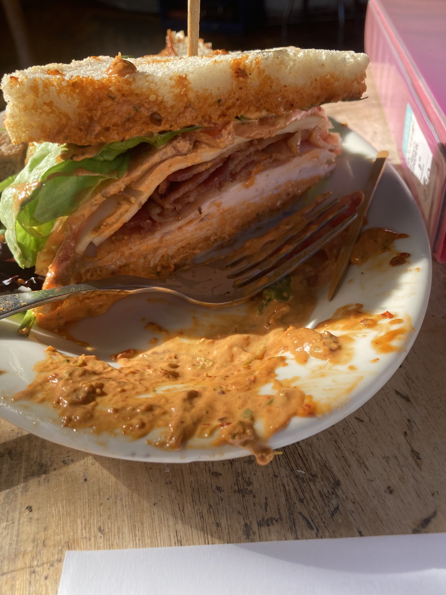 Ā Ā Ā Read moreMy recent experience was disappointing/a waste of time and money. Pros are the sunlit location & peaceful atmosphere, plus they have a charming, soft spoken girl up front that is probably just trying her best. But, that canāt remedy the experience as I am sure there are other places with just as sunny a vibe and a way better food/drink experience. I went around 1pm for coffee and a sandwich. The inside seating was pretty full. I waited 30 minutes for my sandwich, (seeing it was busy, I didnāt complain, but I definitely observed people who got there after me receive their dishes before I did. I donāt understand their service system and think they may have just forgotten). I got my latte relatively soon, but it was too sweet for my liking. When I finally received my Turkey sandwich, it was inedible (literally drenched in chipotle sauce, you can see how much I scraped off the bread in the picture below). I ended up forcing myself to eat half of it and leaving the remainder for the trash. A waste of $30. I will find another cafĆ© for my...