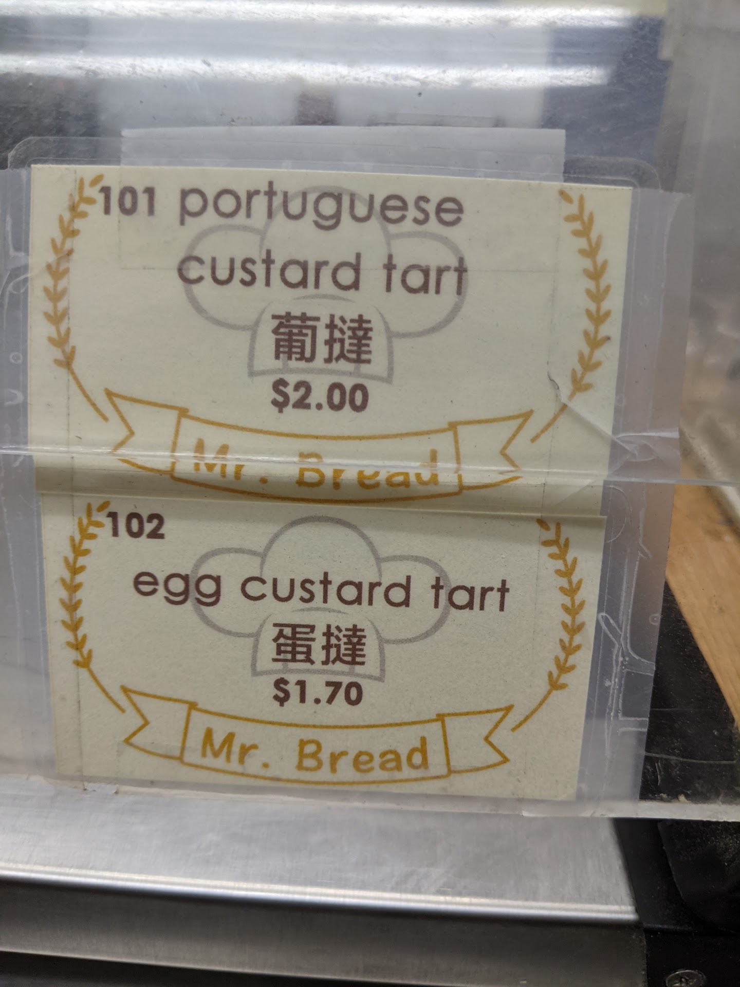 This cash-only bakery sells all kinds of baked goods, but I highly recommend getting the egg tarts. They use puff pastry, unlike some other Chinese bakeries that use shortbread dough, and the tarts all look perfect. Each egg tart costs $2, which is on the expensive side, but it's worth it. In fact, when I visited, I bought all the regular egg tarts left, which was eight of them. The Portuguese egg tarts cost $2.30 each and have a caramelized top, giving them more complexity.