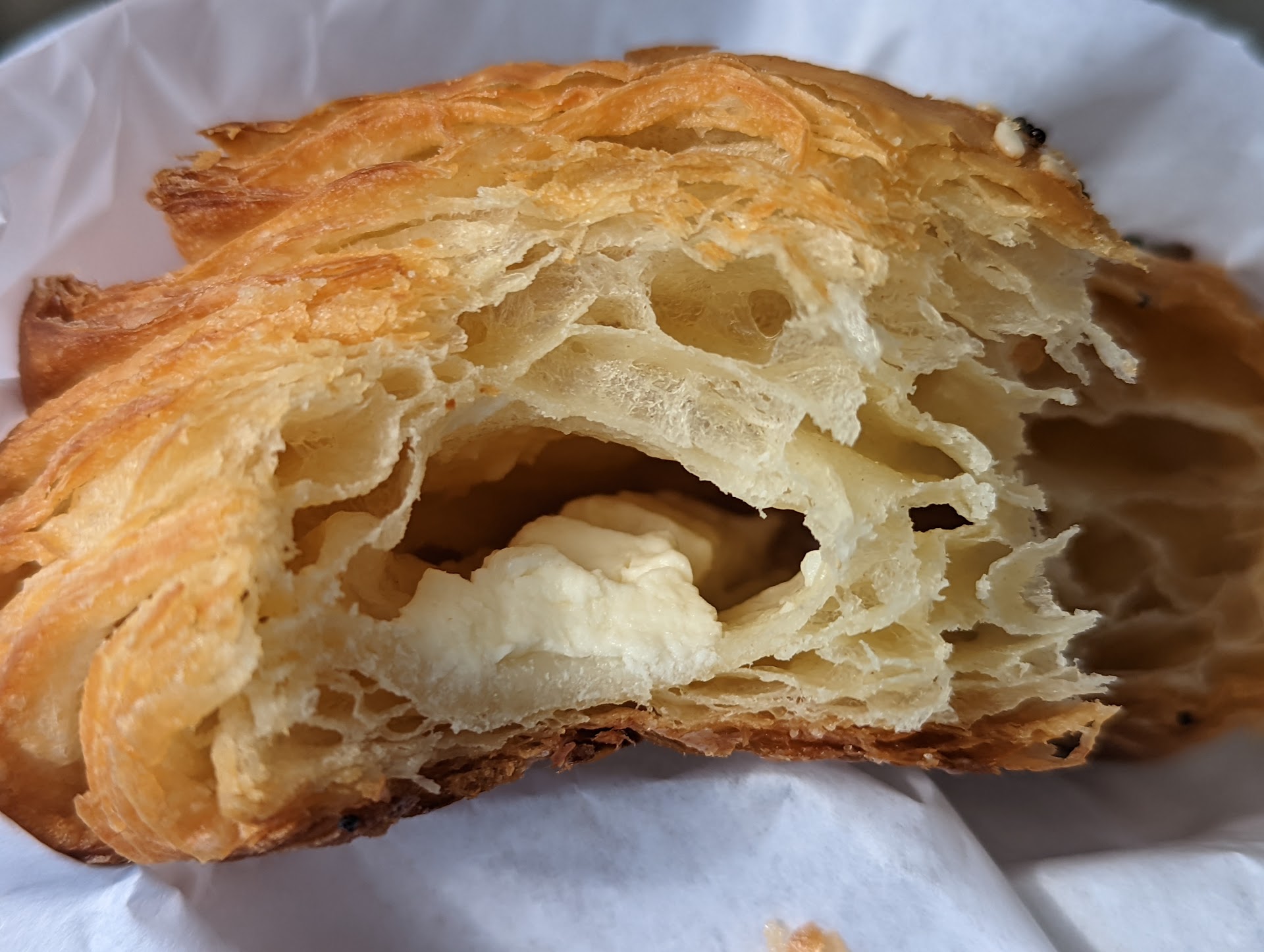 There was a short line when I visited on a Wednesday afternoon. It appeared that the indoor seating was closed off. When it was my turn to order, I stepped to the counter and got a "Fresh OJ" and "Everything Croissant" which totaled just under $10. Paying was easy because they accept mobile payments and cards. The juice tasted fresh but was in quite a small cup for $4. Still, it was a reasonable serving. The croissant was super flaky and there was a good amount of everything seasoning on top. It was filled with a squiggle of cream cheese. Utensils, napkins, and that sort of thing were on a little table further inside. The walkway wasn't very wide, but a small wheelchair could squeeze through. Overall, it was a good experience, though pricier than I expected. But if you're going to a cafe, it's because you want to splurge a little and not make a drink...