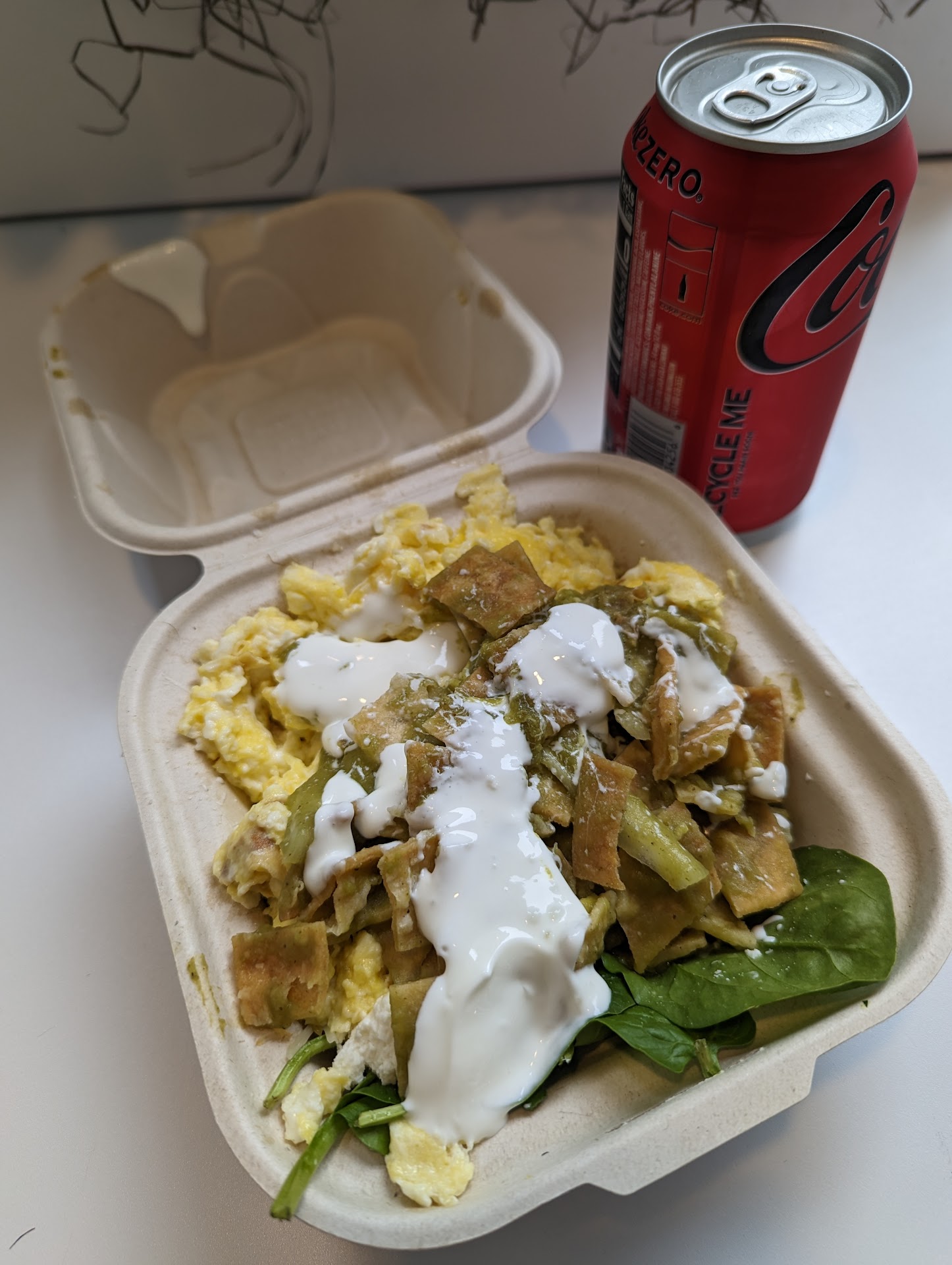 Read moreI came in to order a chicken Tikka masala sandwich but after the rebranding from Miss Tomato to Nosh it's not on the menu anymore for now. I decided to try their special, the chilaquiles Verde. Taste wise it's not bad. Some scrambled eggs, with onions and chips cooked in Verde salsa over fresh spinach. However I can't help but feel cheated as my "bowl" came in a tiny takeout container that looks to be used for side salads. This thing costed $11.99.
