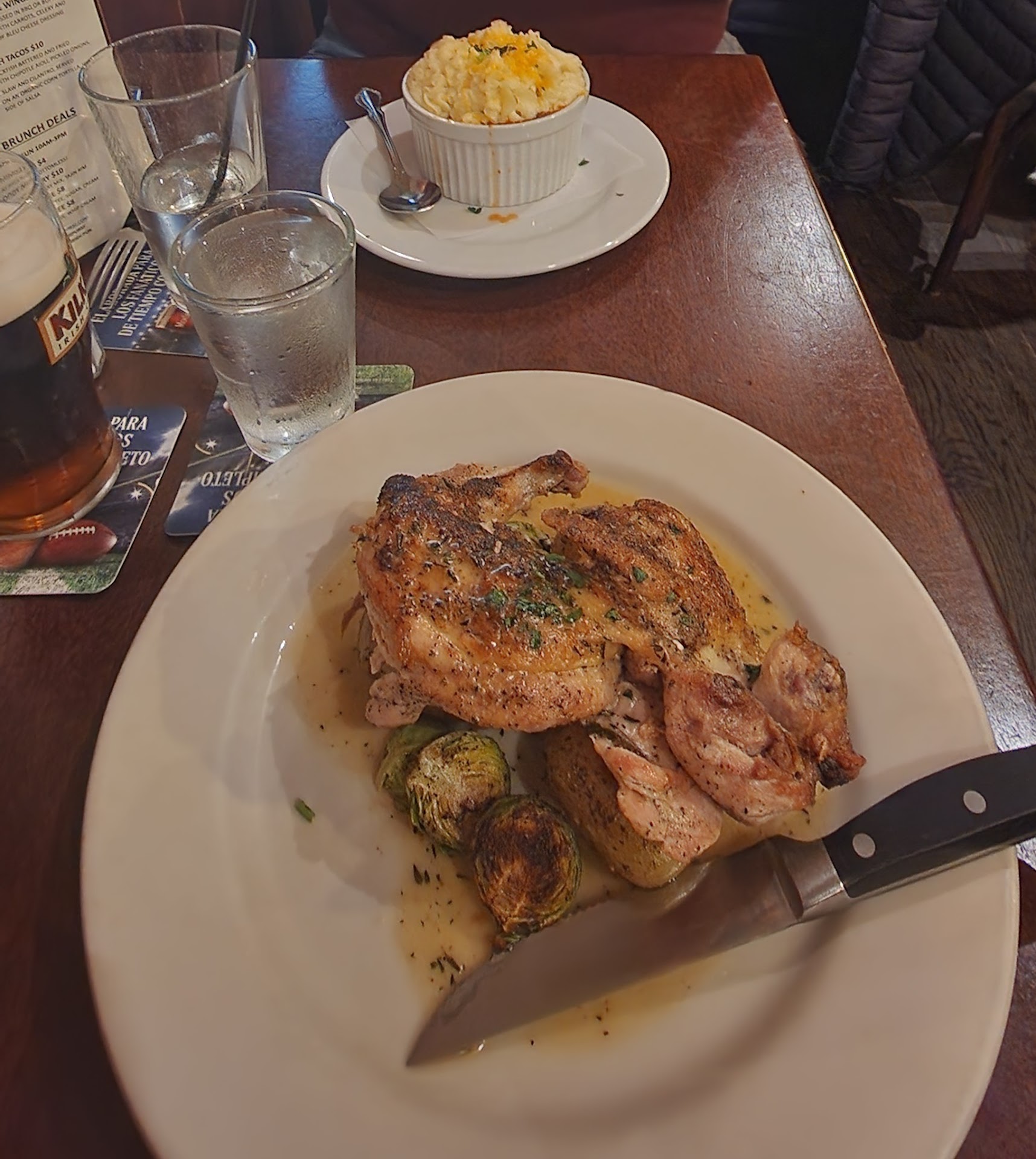 My girlfriend and I got the Cottage Pie and Half Roast chicken with Burrata & Prosciutto as a starter. Cottage Pie was so good and filling. The Mash potatoes on top were creamy and delicious. The Half-Roasted chicken is amazing. It's absolutely amazing. Takes a bit to get done, around 20 minutes. But it's very well worth the wait. The sauce is just enough to be enjoyed with the dish. The chicken isn't swimming. The chicken was perfectly cooked.