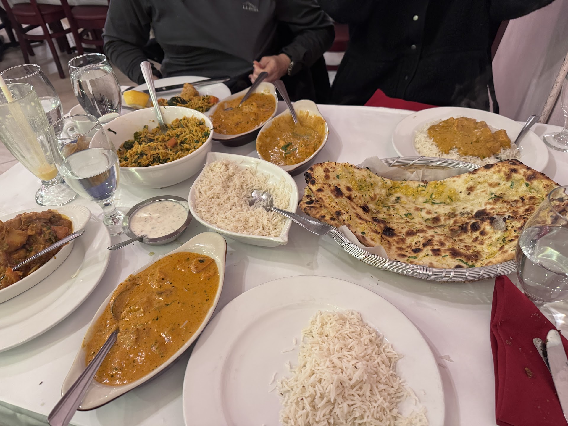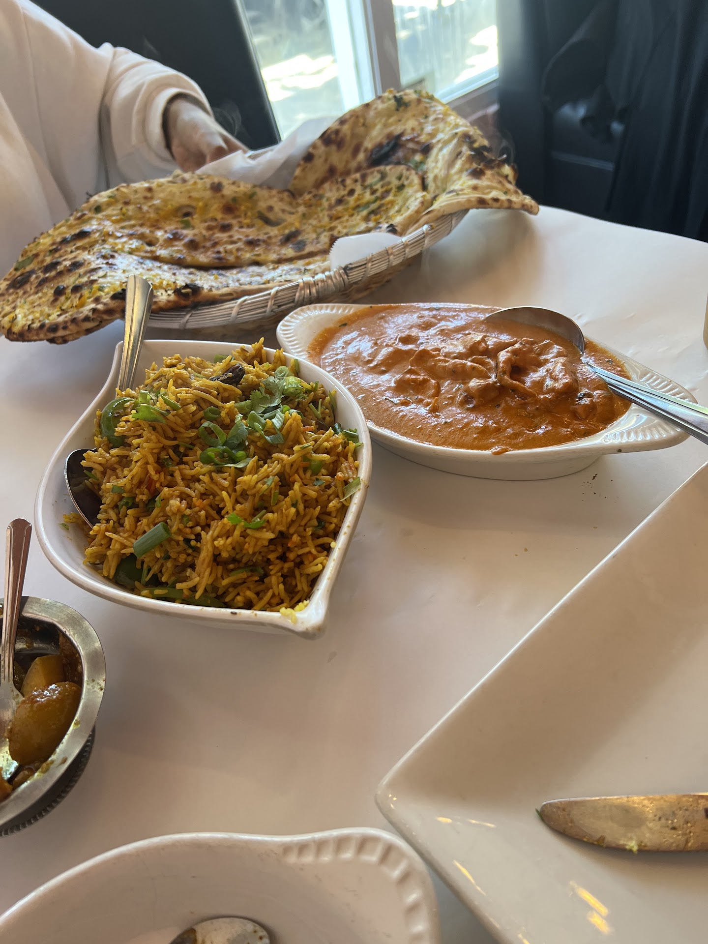 While we were excited as the entrees were brought out, we were also shocked to see the size and presentation of the naan, which was served as long pieces of bread. It was nice to break off pieces of the long slices of naan, which was also nice and fluffy.