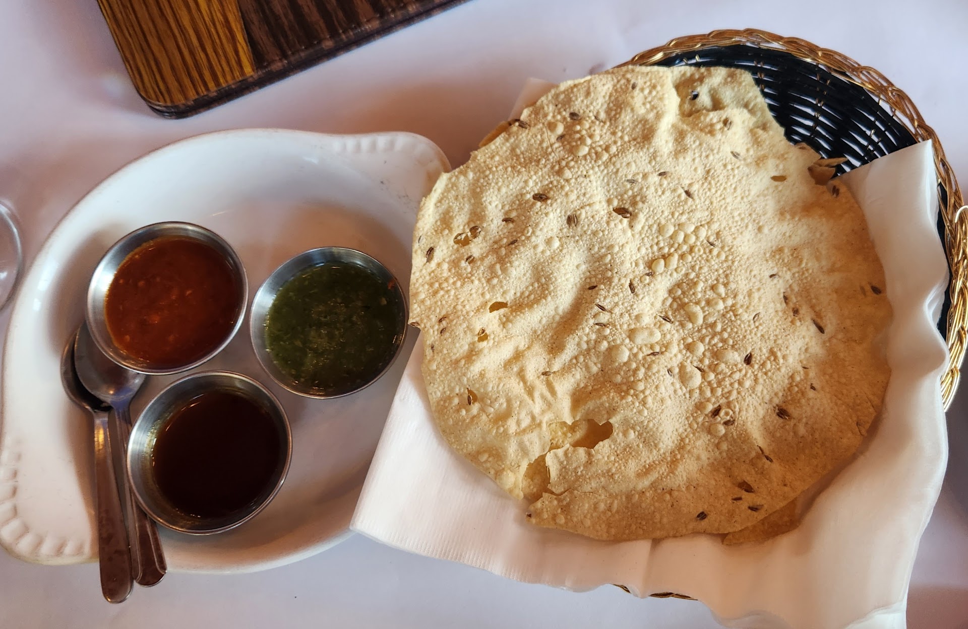 We were immediately impressed as they brought out a platter of thin crisps (not sure of the name) with three sauces, one which was super spicy, one that was herbaceous, and one with a nice sweetness. This whetted our appetite and built the anticipation for the entrees.