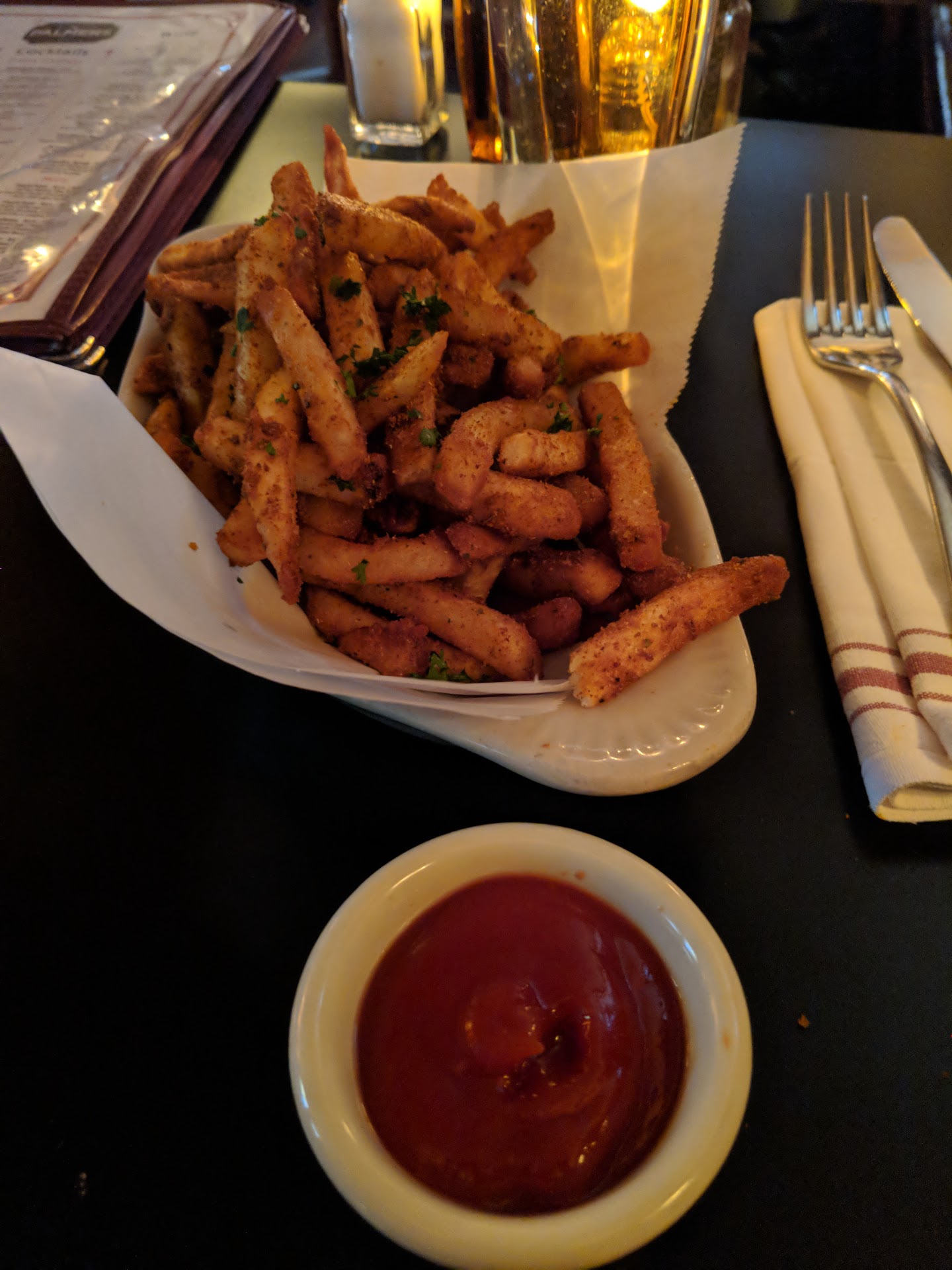 Outdoor seating during COVID could use some windbreaks to make it more comfortable in the cool months, but the service and food more than make up for the COVID protocols required to allow restaurants like Palmer's to stay open. Decently varied menu. The weiner schnitzel was appropriately flat and large; the beef gnocchi looked delicious and was devoured by its ravenous predator with satisfied sounds being made; and I had the burger with gruyere and bacon, cooked perfectly and accurately to Medium, with a side of curry seasoned fries, whose flavor comes from a dry red curry powder. The burger was delicious, though the gruyere flavor was masked a bit with the greens, tomato, and aioli that were included - I'd recommend they offer a heavily smoked gruyere instead, or choose one of the other cheeses offered. The fries were amazing - I actually love a good red curry ketchup with sweet potato fries, and this was a close second. A bit disappointed that two in our party of four selected separate beers from the list that were out of stock at the time, but it was a COVID-full house on a Tuesday night, they were fairly rare craft brews, and, well, COVID. Definitely...