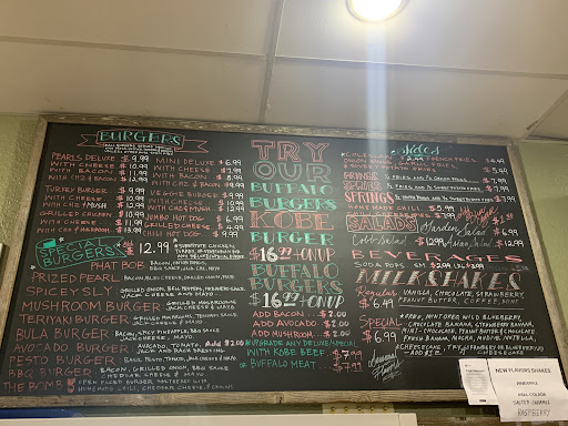 Read moreWe stepped into Pearls Burgers for an Avocado Burger and a Phat Bob Burger. They didn't ask us how we wanted it cooked and was pleasantly surprised to see that they were both perfectly medium well. They are filling burgers, they do not skimp on any of the ingredients which is awesome! We also had some garlic fries, and a 1/2 & 1/2 order of fries and onion rings. The onion burgers are too thin and were over-fried so not a forte of them, the garlic fries were basic delicious barely sauteed garlic topped fries, the crunch on the fries themselves was great though. The portions were satisfying for each side being $6 and $8 for the 1/2 &1/2 They also have buffalo burgers which start at $15 and they are amazing dense and Keto (minus the bread)- Paleo (minus bread) friendly burgers. You are able to customize the burgers as you please and they also have smaller sized as well as NON-MEAT options..Anybody can find something to eat here for sure.. They also have self serve pickles which is pretty cool Its a on the smaller side restaurant, clean and old schoolesh enough to be a casual chill place to go eat at before a night out, or simply to end the night off with a...