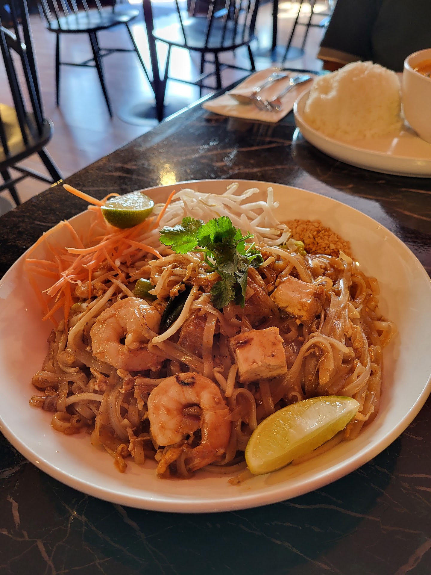 The pineapple fried rice felt like a killer fusion - raisins with an Iranian twist, the turmeric from Jahanvir's Bengali side, and the chicken marination in lime and South Asians spices with the overall cooking execution in the Thai fashion was tasty. I didn't find myself a fan of pad thai much, because I didn't order it, but as a family we enjoyed all the dishes. I would recommend pad thai with tofuu if you're vegetarian TBH.