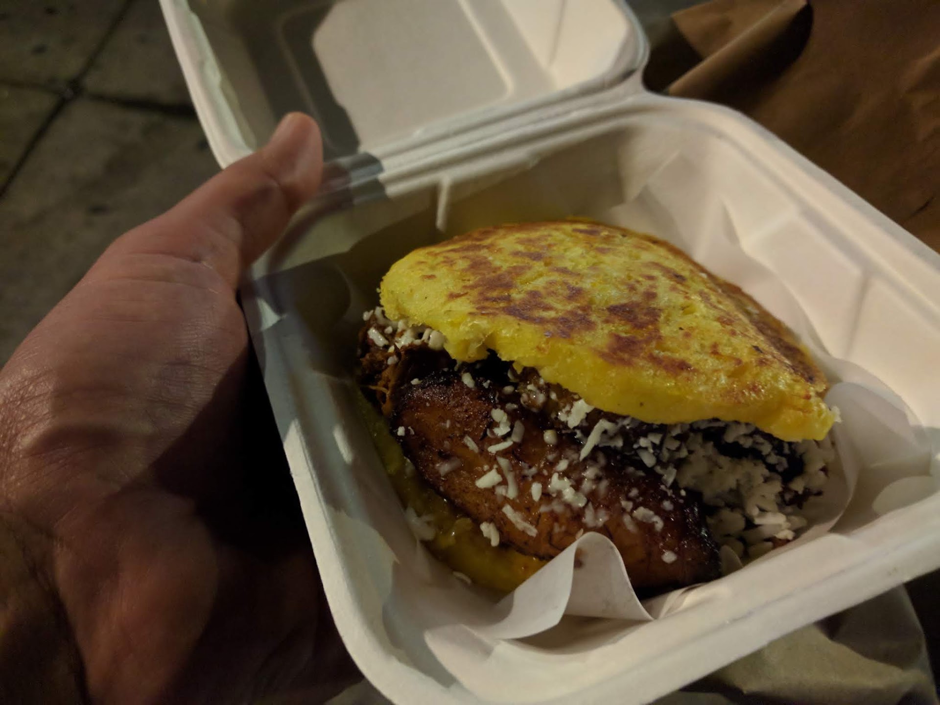 I got a small desert/snack size container with the arepa. It was a decent sized corn pocket which had become soggy. It had a nice sweet tinge which balanced the taste of the shredded beef perfectly. Unfortunately, the beef was a little chewy. It also two fried plantains that were way too oily for my taste. Overall, I thought this was passable. My memories of Arepas is that they are crispy/crunchy on the outside and juicy on the inside. Maybe the drive home messed all this up.