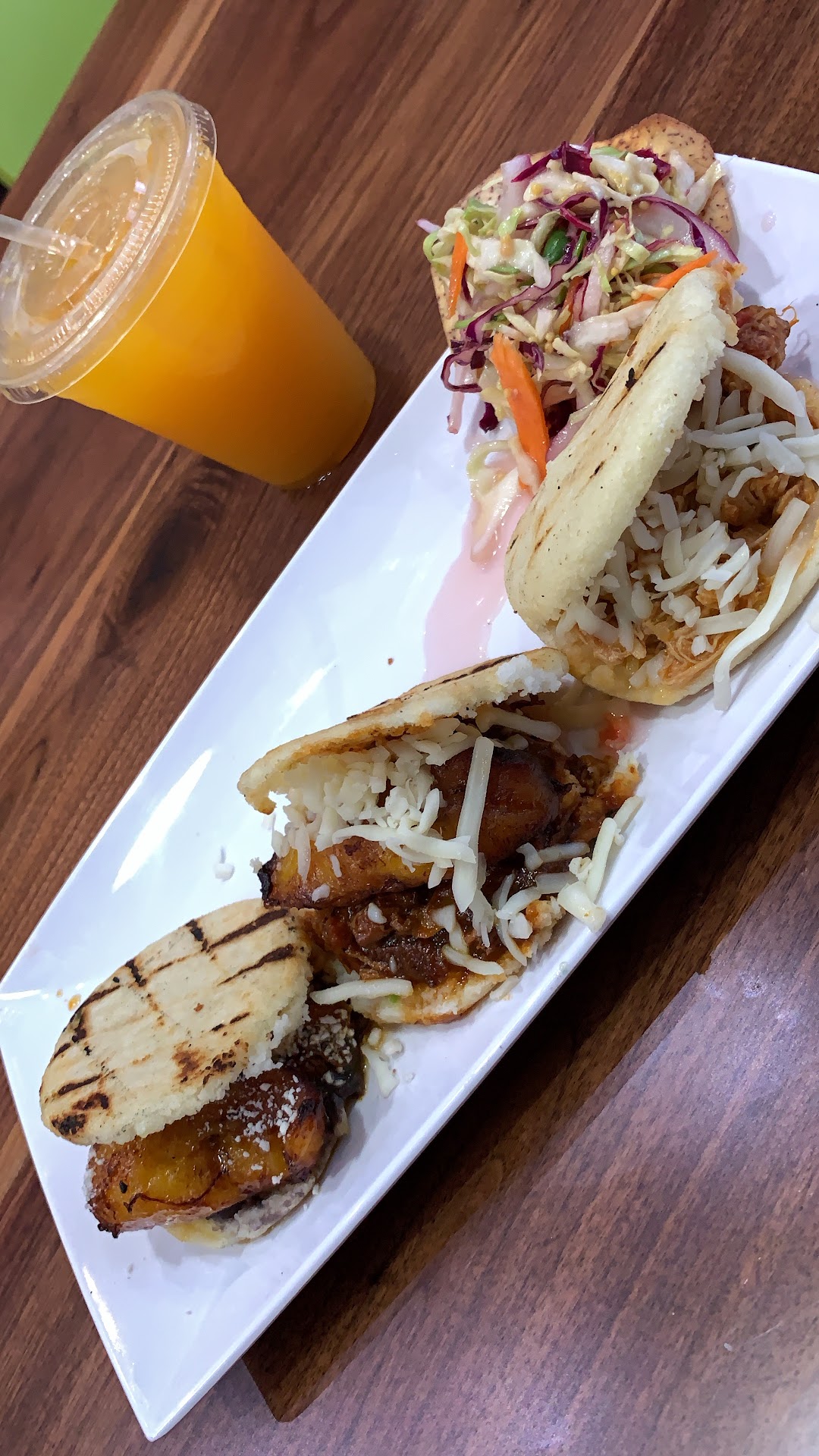 Read moreIf you are Venezuelan and your expectations are very high and you want to eat a good arepa, this is not the right place to remember our flavors. I did not find the Venezuelan’s flavor in any of the fillings and I ordered 3 different arepas. They do not sell “Reina Pepiada” (very rare cause this is the famous Venezuelan arepa), I ordered the "Arepa trio tester" and they served them on a plate accompanied with a chip with an excessively wet salad topping that soaked the 3 arepas, these went from being "Crispy" as it says its advertising to a arepa of watery dough, the fried chicken is quite spicy. In short, I think it's a fusion of Mexican food with Venezuelan arepas or something like that. Expensive for this quality. —— Si ud que me está leyendo es venezolano y sus expectativas son muy altas y quiere comerse una buena arepa, este no es el lugar correcto para recordar nuestros sabores. No encontré el sabor venezolano en ninguno de los rellenos y pedí 3. No venden reina pepiada (muy raro), pedí el “Arepa trio tester” y me las sirvieron en un plato acompañado con un chip con un topping de ensalada excesivamente mojada que empapó las 3 arepas, estas pasaron de ser “Crispy” como dice su publicidad a una arepa de masa aguada, el pollo mechado es bastante picante. En definitiva creo que es una fusión de comida mexicana con arepas venezolanas o algo...