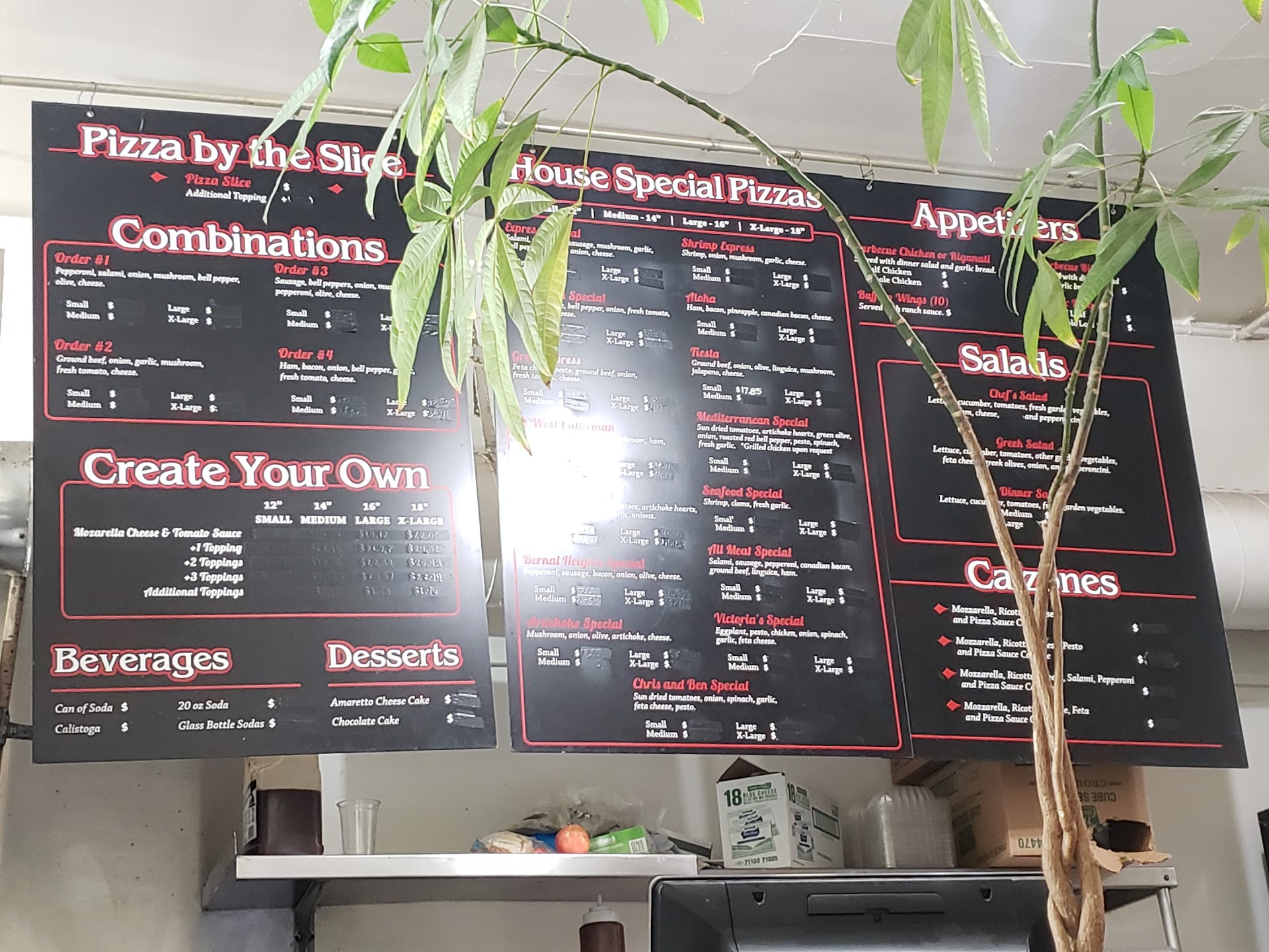 I was surprised my slice was given in a box instead of just a plate / napkin or foil by the looks of the interior which needs a good update. Also I found it strange that the entire menu had no prices and looks like the prices were blacked out by marker.