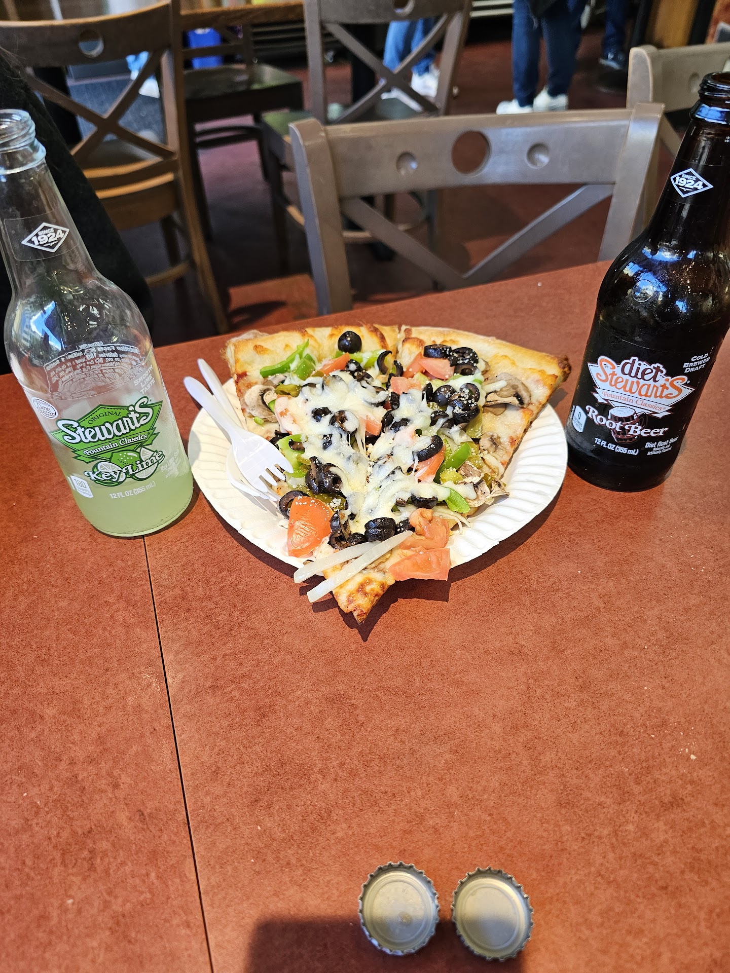 Yes, it's the only place around here that sells pizza by the slice, but beware of what you will get: They only have 2 types of pizza premade here: cheese and pepperoni. Extra toppings are 50 cents each (that includes the aforementioned pepperoni). What that means is they add toppings to one of the above, sprinkle more cheese on top, and reheat it in the oven. What you get is a weird layering of dry crust, sauce, old cheese, then the fresh topping, with fresher cheese sprinkled on top of all that -- all making for a very odd presentation when it comes out of the oven. They should at least add the fresh cheese first before adding the topping to make it appear like a normal slice of pizza, (to masking their peculiar reheating process).