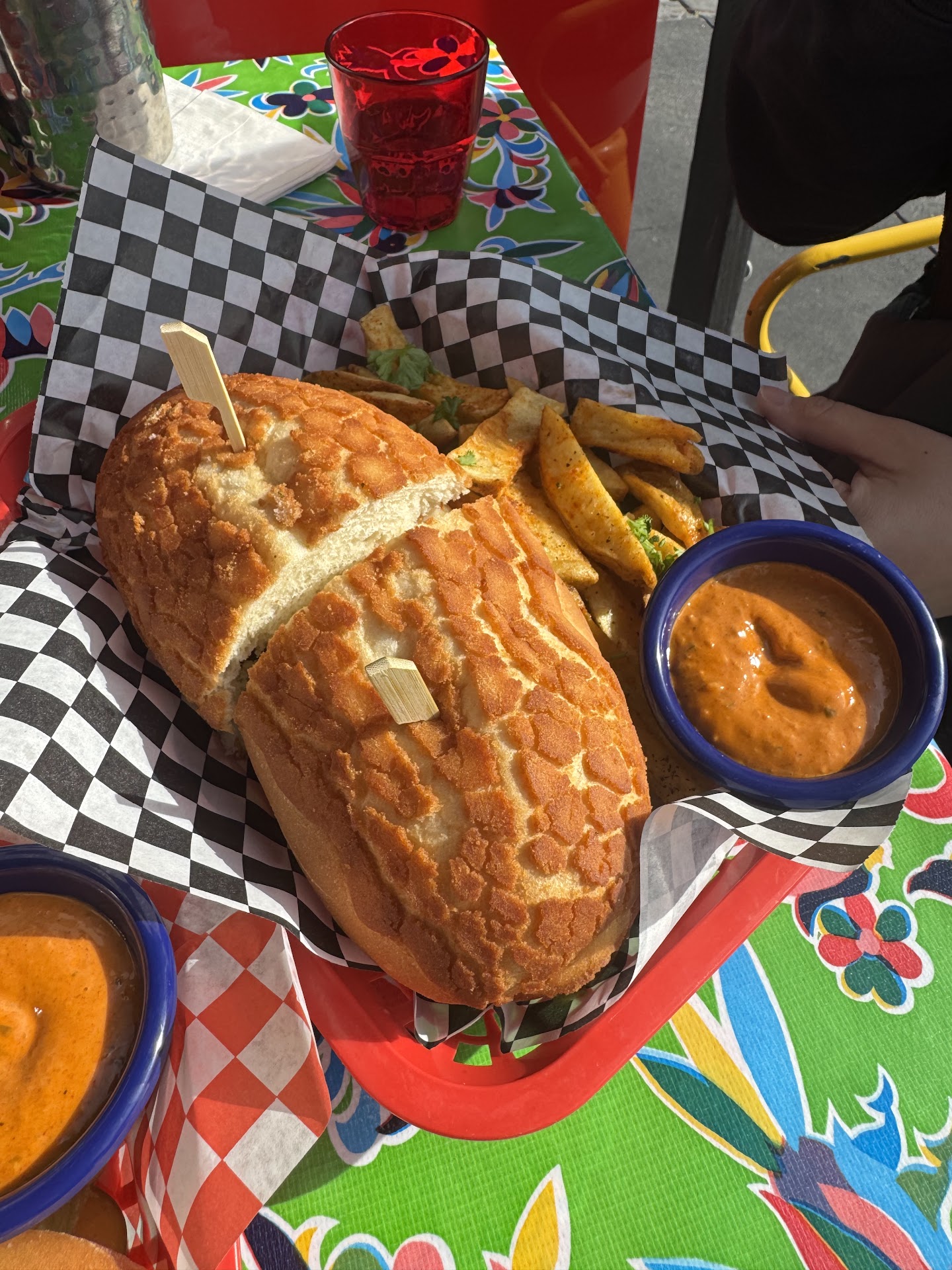 Read moreWe picked up food to go today and their kitchen did not dissapoint! The chicken was deliciously seasoned and crispy. You have options for their combo to choose from too so I opted for the mini cornbreads which were yummy! The gumbo was so flavorful. We also got a Po' Boy Chicken Sandwich which was so good. Last but not least, we ordered some Beignets and they were yummy! Each one was crispy on the outside with a soft warm center and coated with powdered sugar on the top. These come in a set of 4 per order and paired very well with the warm chocolate sauce they provided on the side. Our waitress also checked with us if we needed utensils for our to-go order. Really wish we could have stayed to enjoy the food there as the atmosphere and location was nice. There is indoor and outdoor seating, and the place is small, so big parties may want to call ahead to ensure a table. We are definitely going back one of these days to try the pasta, jumbalaya, or the fish and chips!! Thank you to the staff for such...