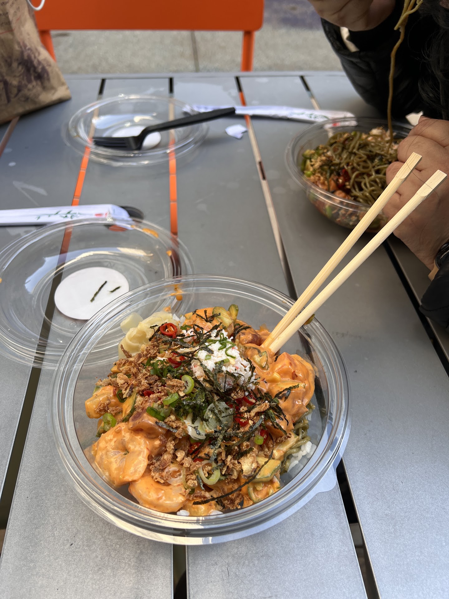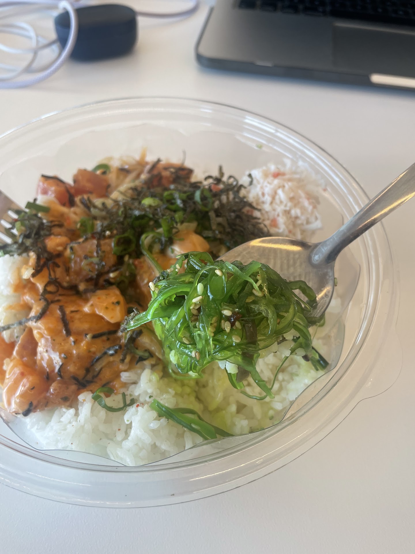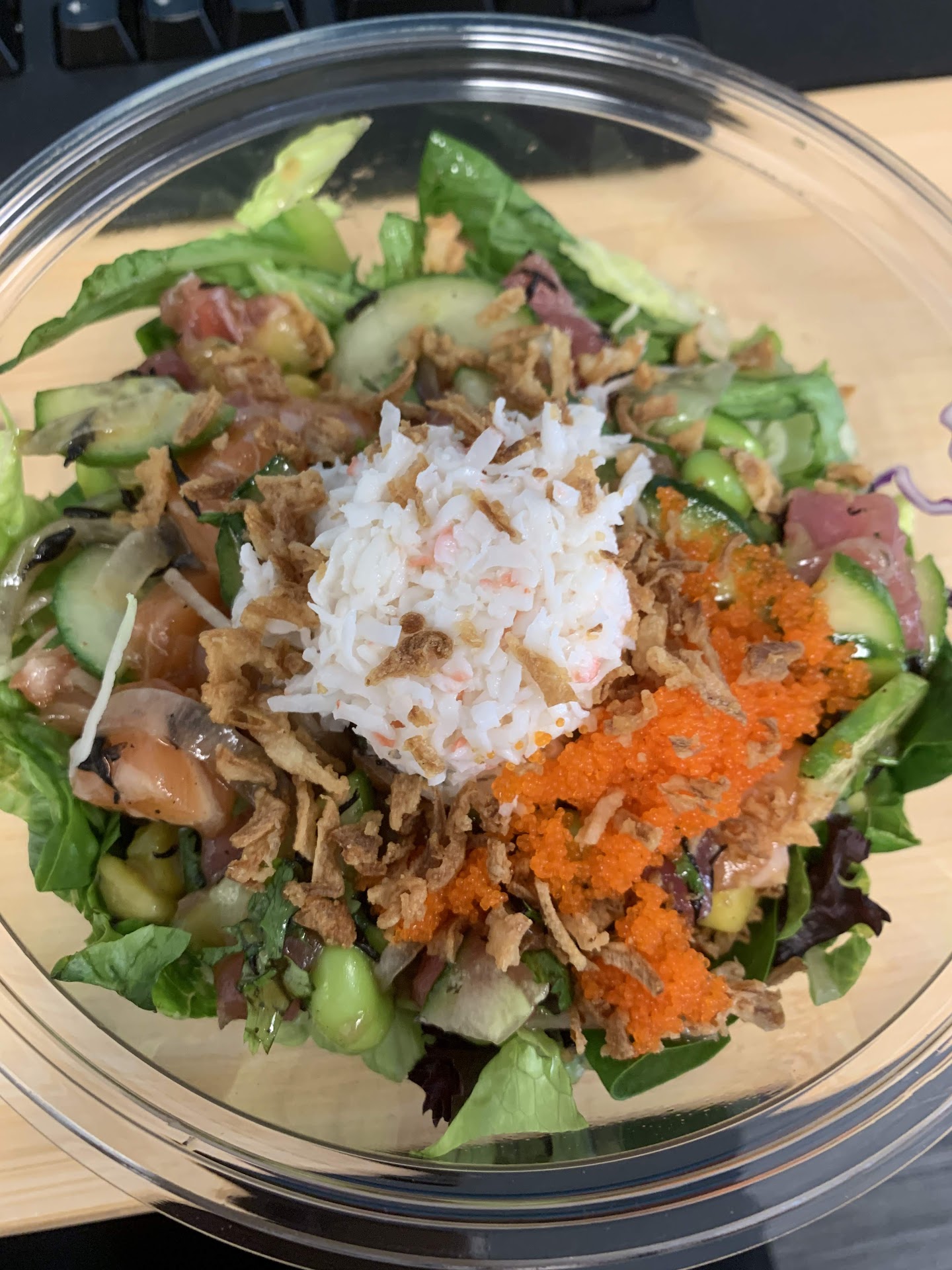 I ordered a salad with a scoop of tuna and salmon. I added cucumber, cilantro, edamame, onions, with their ponzu sauce. On top, I added surimi salad, seaweed salad and masago. The server was really fast and was super nice. I went back to my office to eat.