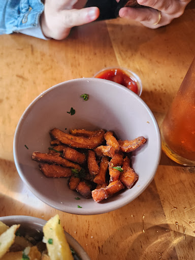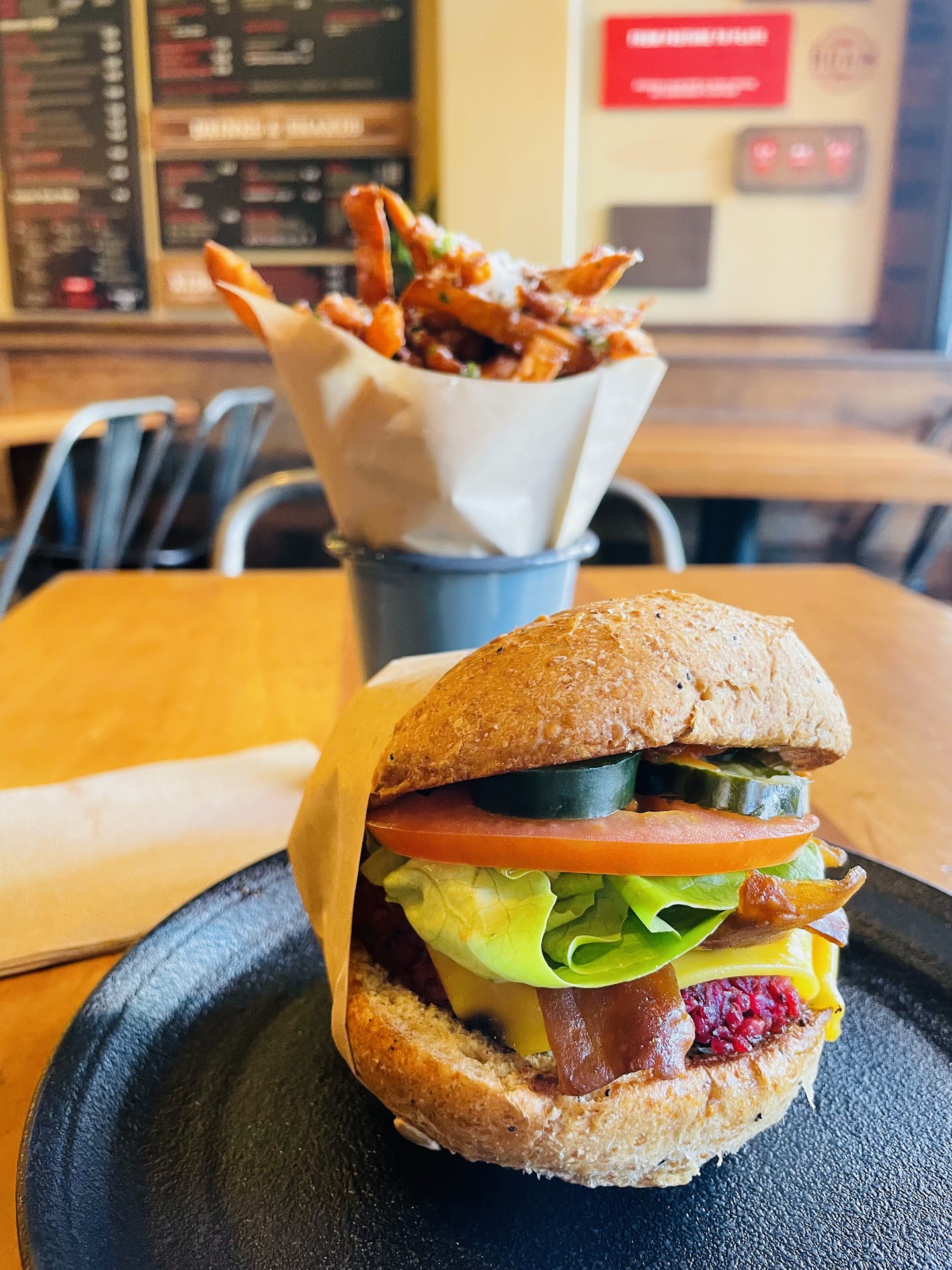 Read moreI love trying veggie burgers and meat substitutes, so I wanted to try Roamâs vegan bacon burger. The first thing I noticed was how incredibly expensive it was. At Shake Shack earlier this week, a bacon burger and fries were $14. This was over $25, and it wasnât even meat I was paying for. That said, the burger was made of very fresh ingredients. The bun was wheaty and slightly sweet. The pickles were unlike any Iâve had on a burger before, more of a bread and butter pickle. The faux bacon was chewy like bacon and a little salty but not notable and definitely not crispy or fatty. The burger itself surprised me because it wasnât even trying to be meat like. It seemed to be made mostly of rice and quinoa and didnât have too much flavor. The best vegan part was probably the melted cheese, which passed reasonably for American. All of the toppings stacked so high it was actually very hard to eat the burger because I could only take partial bites of it! While it was warm and nourishing, it would not at all have satisfied a craving for a bacon cheeseburger. It was missing the fatty richness and texture of meat and fake meat products. The sweet potato fries were excellent, very crispy and fun, but did not combine at all well with the truffle and parmesan seasoning. I recommend going with the chipotle maple instead. I wish they only had two fry options - truffle russet, and chipotle maple sweet potato. So, it was all fresh and cooked well, but way, way too expensive for a restaurant without table service, and the vegan burger just didn't hit the mark. Some veggie burgers are so satisfying in their own right that you don't miss the meat at all, and this one really felt like health food. If youâre looking for something as a vegetarian that wonât make you miss Five Guys and Shake Shack, you should...
