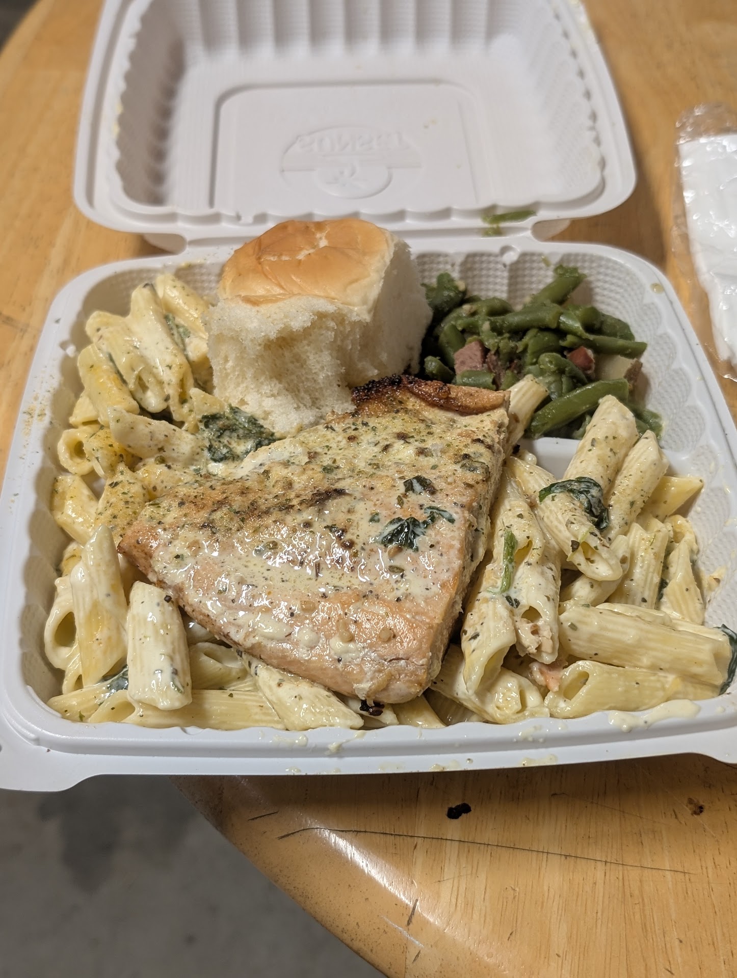 I've been wanting to try Rome's kitchen for a while now seeing his posts on Instagram. He does pop ups in certain locations during the week. Make sure to follow his Instagram to stay updated for his popup locations. Anyways I stopped by his popup for lunch today and boy it did not miss everything was so tasty and flavor full. I ended up grabbing the combo #2 which was ribs and links combo, side of Mac and cheese and green beans, bread roll. Second plate was combo #3 and that was the Italian garlic salmon Alfredo served with greens and bread roll as well. First off the ribs and links were great dry rub on ribs was tasty and BBQ sauce was sweet and tangy. Mac n cheese oooey gooey hella good. I'm not a greens person but the green beans were great. Soft not mushy but just right consistency. Now the garlic salmon Alfredo was something else omg buttery garlicky cheesey. salmon seasoned and cooked well very moist pasta noodles were awesome. A bit on the pricey side for lunch but it is definitely worth it. Huge portions too I couldn't finish my plate!! I will definitely keep up with his posts to the next pop-up to try something new because if these two plates were this tasty I can't wait to see what else Rome's Kitchen has to offer. Keep up the great work!!