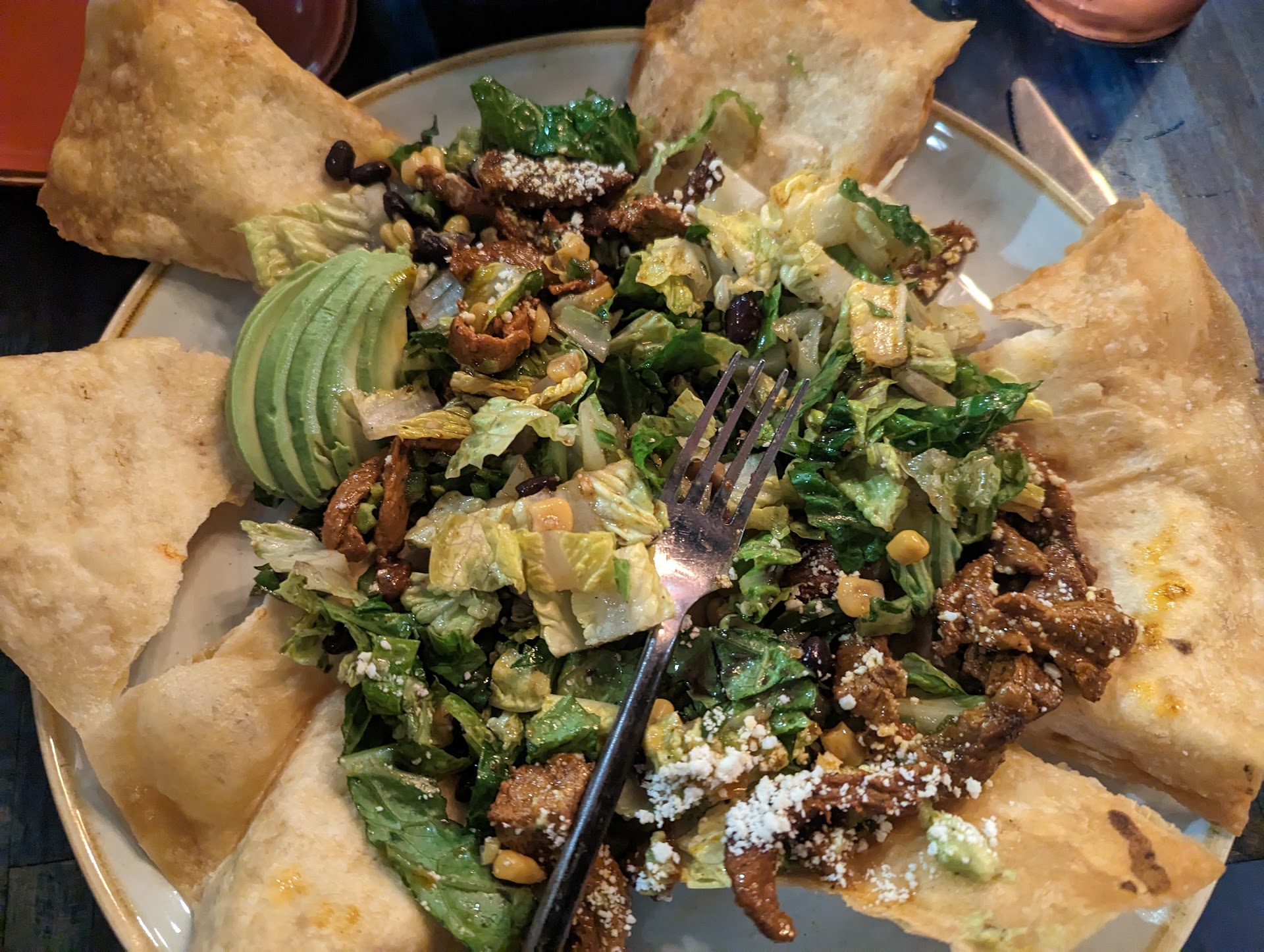 Anyway, what I actually received was not only not a burrito bowl but rather a salad, but also not the correct salad ingredients. It had lettuce, corn, black beans, carne asada, avocado, guac, and chipotle vinaigrette (which are part of the salad but not the bowl that I had ordered) instead of the rice, cheddar cheese, sour cream etc. Also, it was inexplicably missing cherry tomatoes and jalapenos, which are supposed to be on the salad.