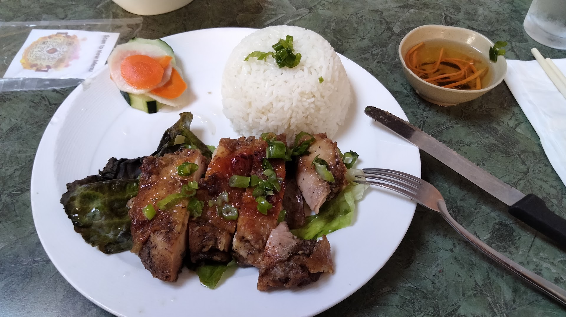 I got the 5 spice roasted chicken over rice and that was delicious. Just the right amount of food as well. My friend got the chicken curry and liked it as well.