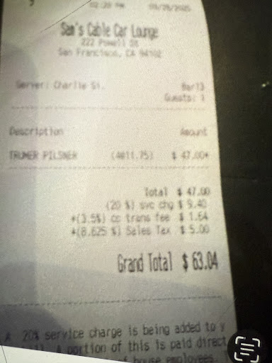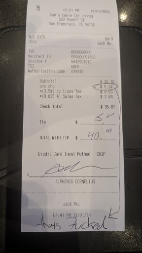 When we arrived we were greeted by an older gentleman and shown to our seats. A waitress came over to take our orders. First of all, the drinks are overpriced but it's right on the middle of the tourist trap so you know... The problem is they add an 18% gratuity to the bill. The service was standard, not exceptional and 15% would have been coming their way anyway. Our bill came to $47.16 with the 18% tip, tax and SF charge included. At the bottom it says (and i'm paraphrasing here) "tip has been included, you may refuse tip if unsatisfied". We didn't refuse at all, we paid $47. Which means we paid the bill plus 17 point something % tip (.16 cent less tip than they suggested). Fair enough right? Well when the waitress collected the bill, she counted it on her way to the next table, she stops, turns around and tells us we didn't pay enough, we owe her " one dollar" more. My girlfriend replies "Well the tip was included in that bill and is 18% so that should be enough". The waitress said nothing, gives us both a look as if to suggest we have disgusted her. She goes over to another waitress standing at the door and points and gestures towards us and tells her how we didn't give her the extra .16 cent. We then just left out of pure anger and annoyance. We probably should have said something to management or the waitress in question but felt it wasn't worth it, this is how they like to do business clearly. Avoid this place. They don't deserve the 18% tip they will add on to your bill and they will treat you like garbage if you pay anything less (remember we paid 17.8%!!!). Terrible experience, they attempted to publicly...