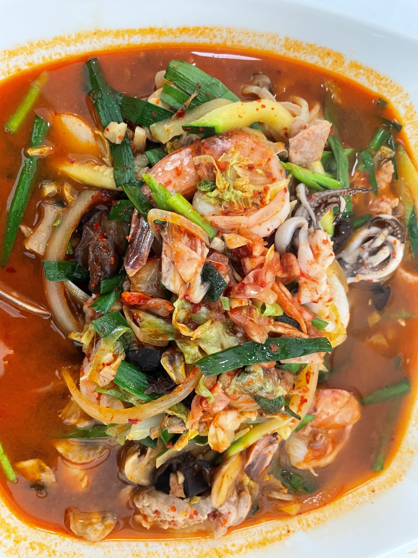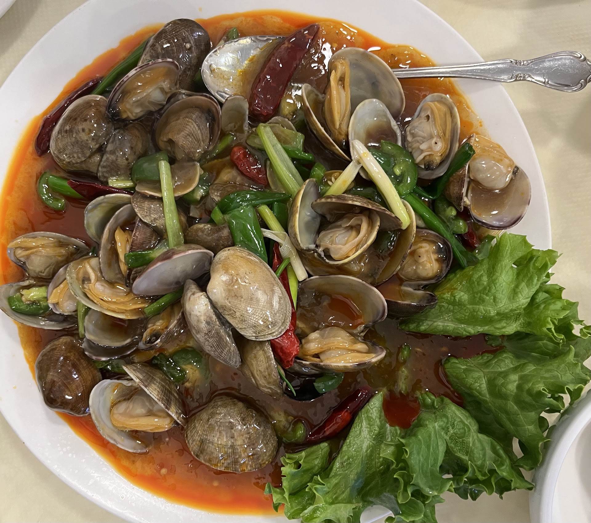 My favorite dish at SanWang is Chǎomǎmiàn (炒碼麵) (Jjamppong) a spicy noodle soup in red chili generously flavored with green vegetables (chives, bok choy, you choy, or sometimes Napa, depends), black mushrooms, meat (beef or pork) and a variety of seafood including Tiger shrimps (size 16/20 at least 4-6 pieces), scallops, clams (small but in shell), squid, etc. The noodles are house made possibly by the Brother No. 5 who appeared in “Martin Yan Mondays” (“If Yan Can Cook You Can Cook”) on KQED in 1980s.