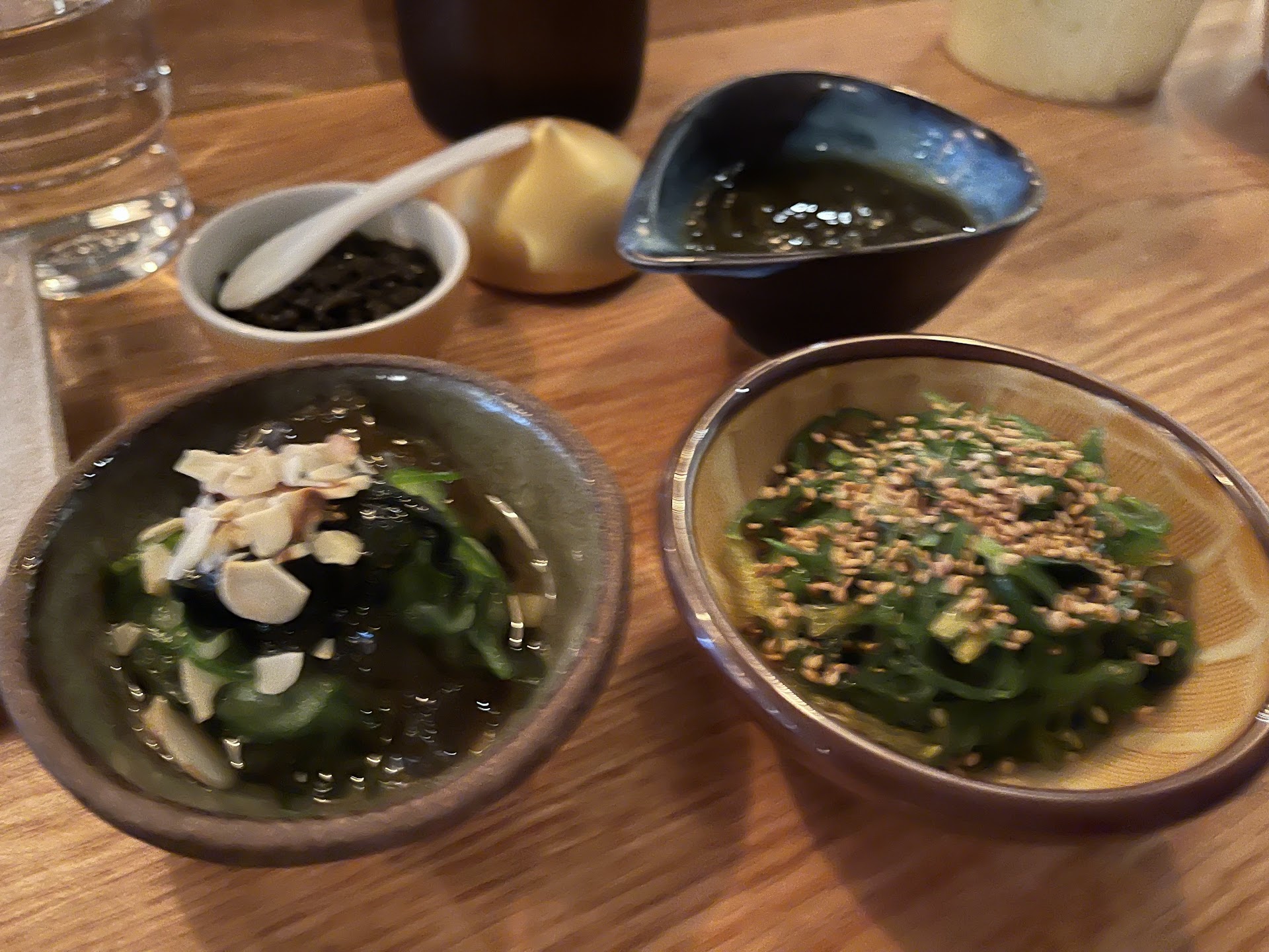 monuku: cold slimy seaweed app dish, interesting and fresh flavors, but not my cup of tea; def order one to share just to try something new