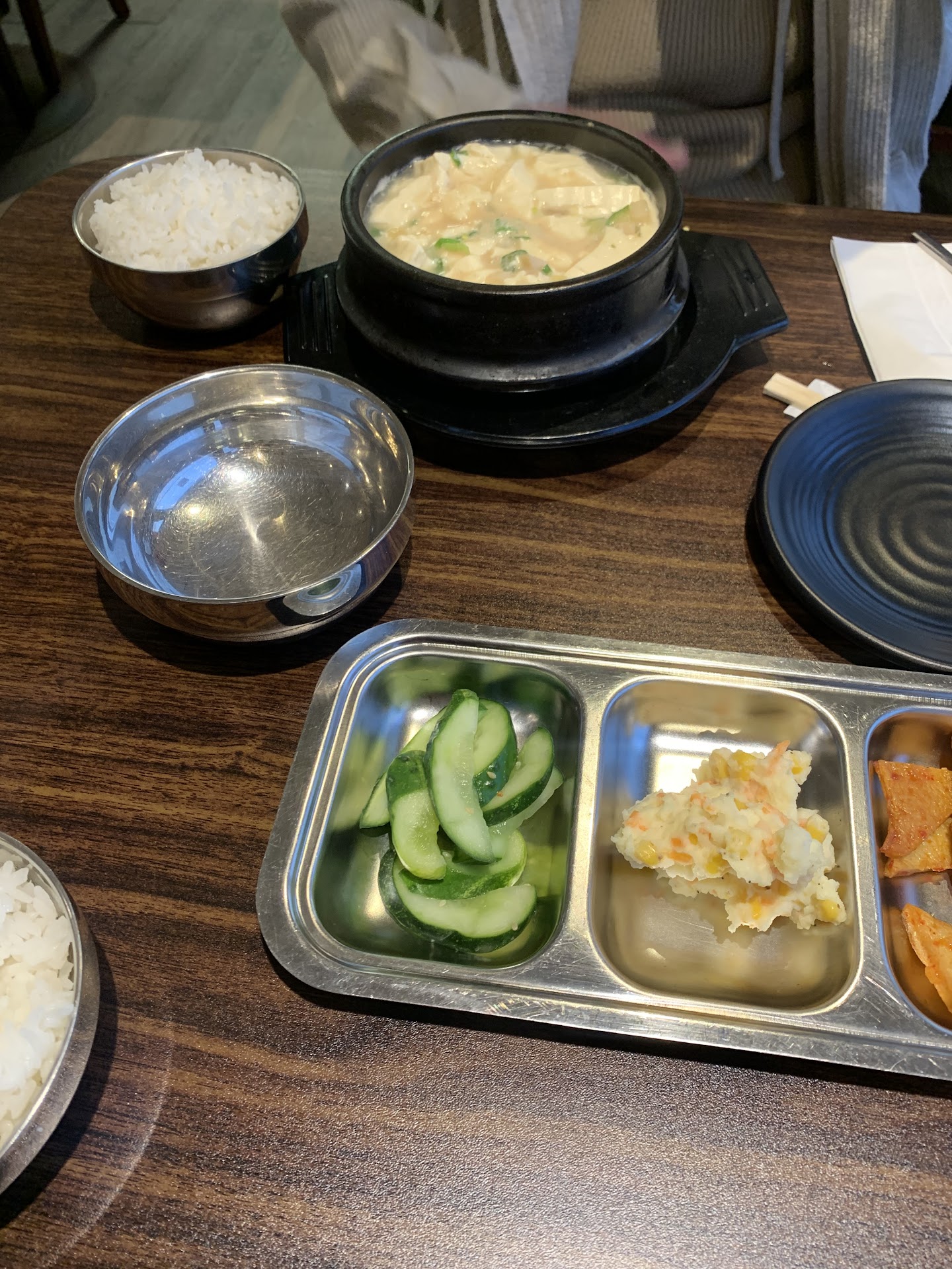 Ordered: Kimchi stew & tofu stew, each entree came with a bowl of rice. Kimchi stew was flavorful and I personally like adding a dash of vinegar (which the restaurant happily provided) to make it more sour. Asked for three refills of side dishes because we were a big fan of the potato salad and kimchi!