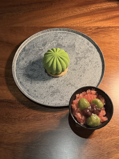 The final dessert paints a Japanese springtime sakura Motif: pink shaved ice with matcha mochis, topped with sweet red beans, Kanten (åÆå¤©) and Yokan jello. The dessert send home the message that you are dining at a Japanese restaurant.