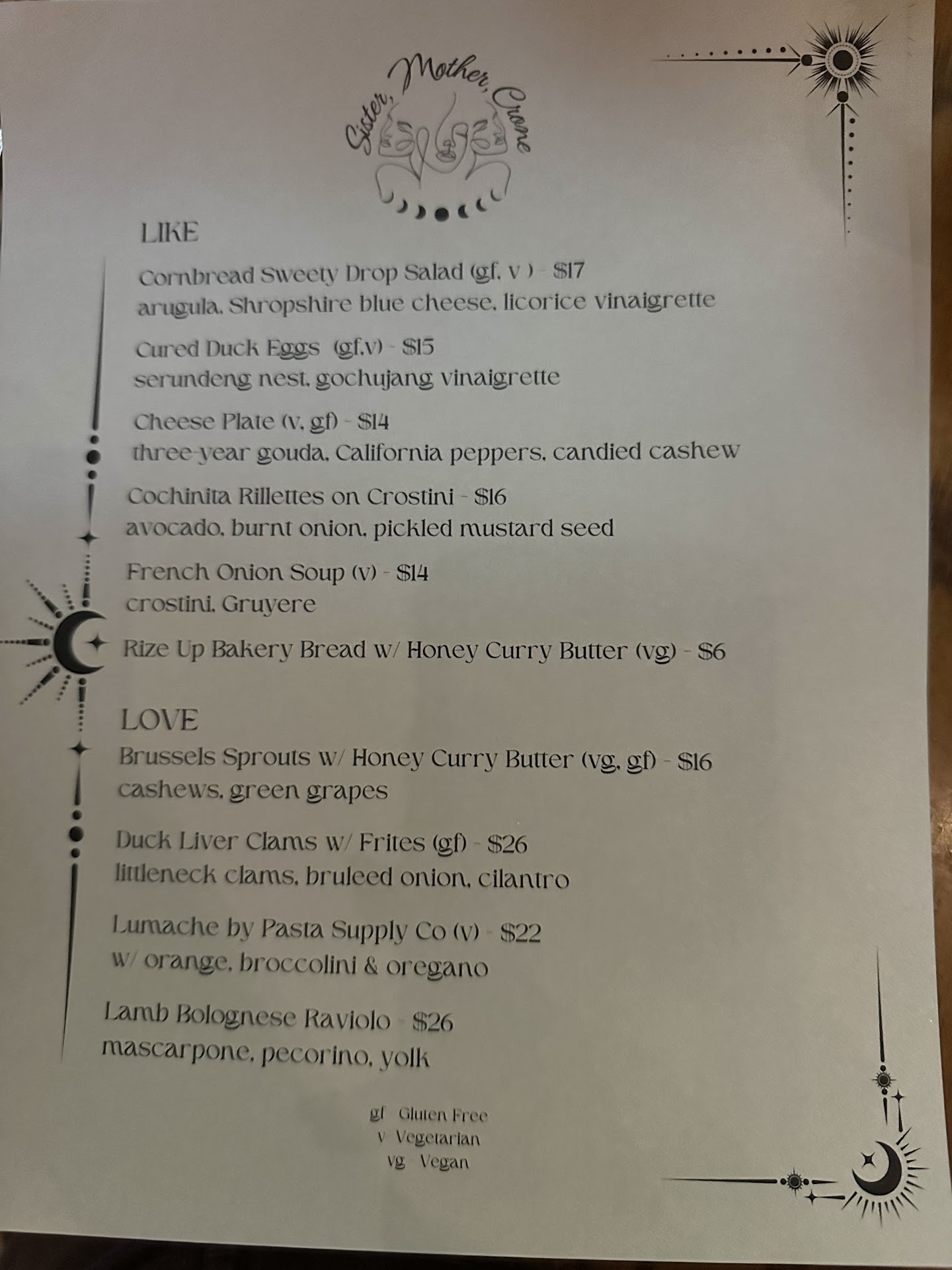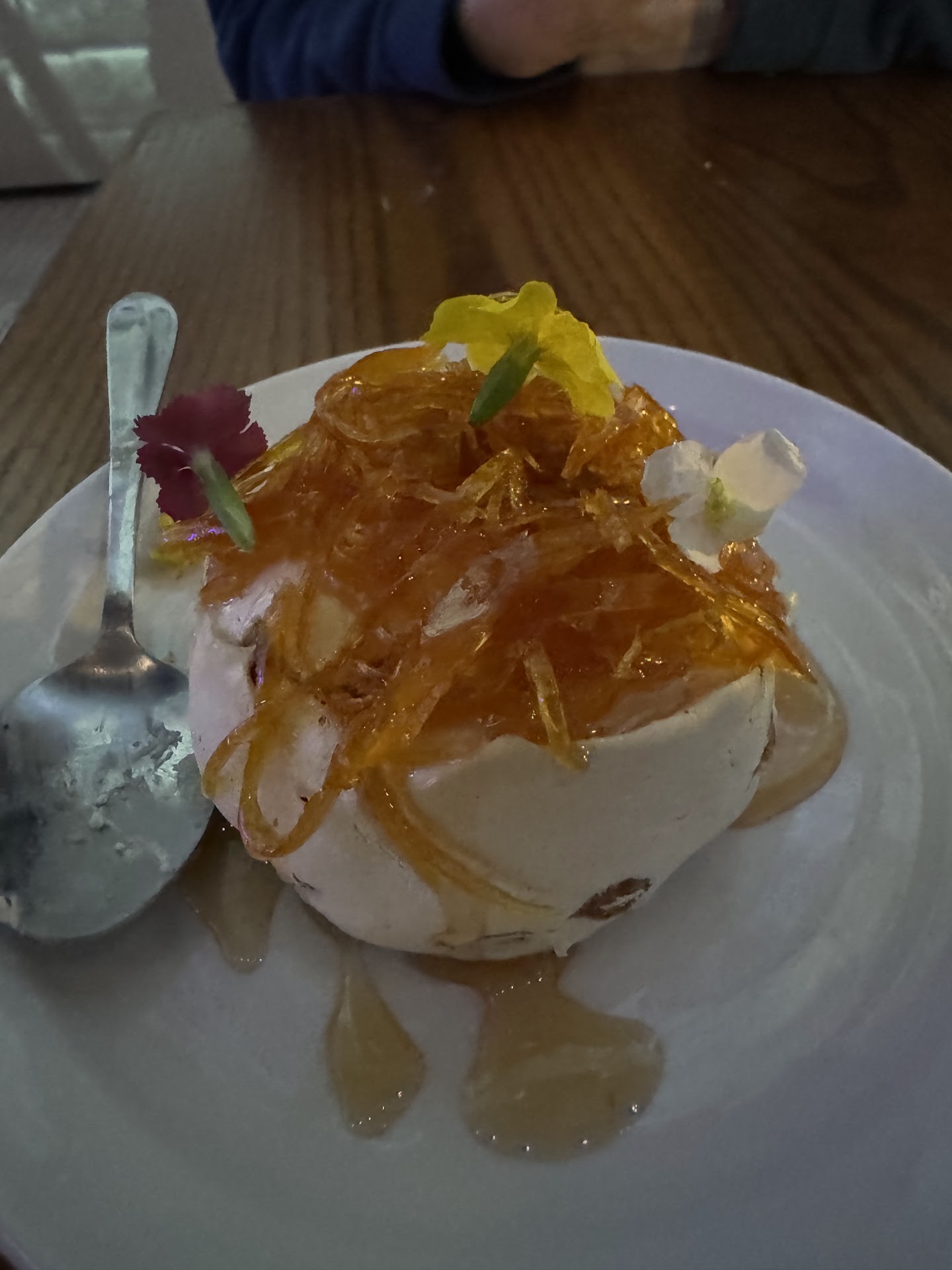 The ambiance is fun with the projections and decor and the DJ seemed to have a great time the whole night which brought nice energy to the place. The service was slow (again pop up kinks) but the staff were super friendly so we didn’t mind that at all. Where my review is lowered is due to the food: The cocktails we got were both great (Mother, Crone) The starters were delightful and unique flavors. The cornbread salad had a nice flavor with the blue cheese but had too much vinaigrette so it was too wet and salty. The cured duck eggs with gochujang and the peanut coconut crispies were fantastic! Highly recommend. For mains, we got the steak with potatoes and the miso seared salmon with carrots. The steak had good flavor though not cooked rare as requested (0 pink even in center slices) and the thousand layer potatoes were incredible. The salmon was cooked perfectly with very tender just-cooked center and the miso sauce was awesome. The carrots I was hoping would be fully roasted but they were almost all raw still and very crunchy. Some people prefer that I guess! For dessert we shared the milk and cookies semifreddo and it definitely tasted like milk and cookies but the flavor was very subtle and it was mainly “milk” in our slice.