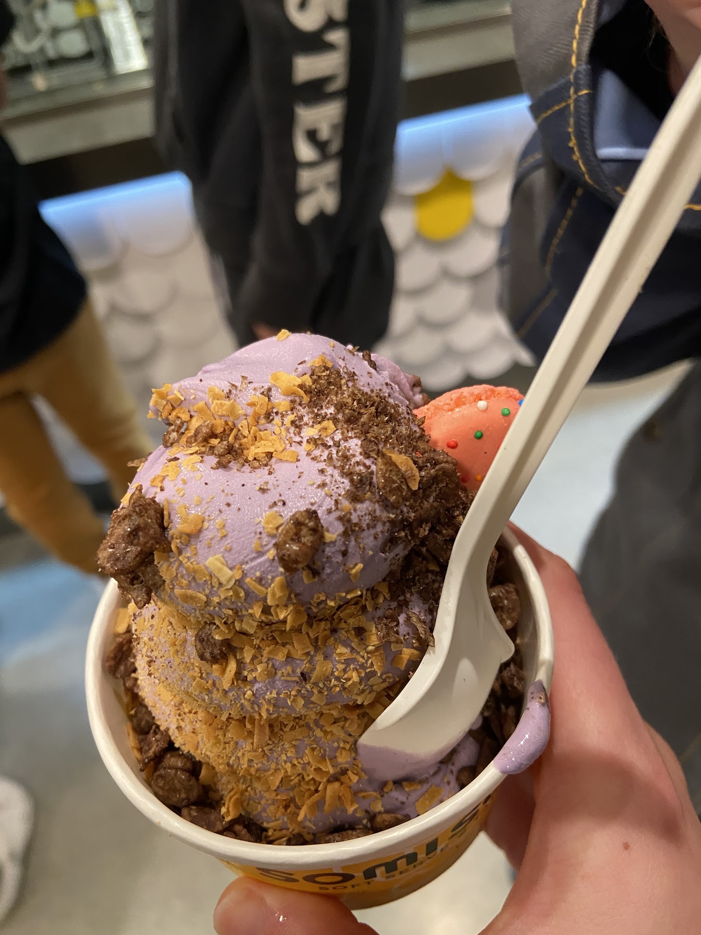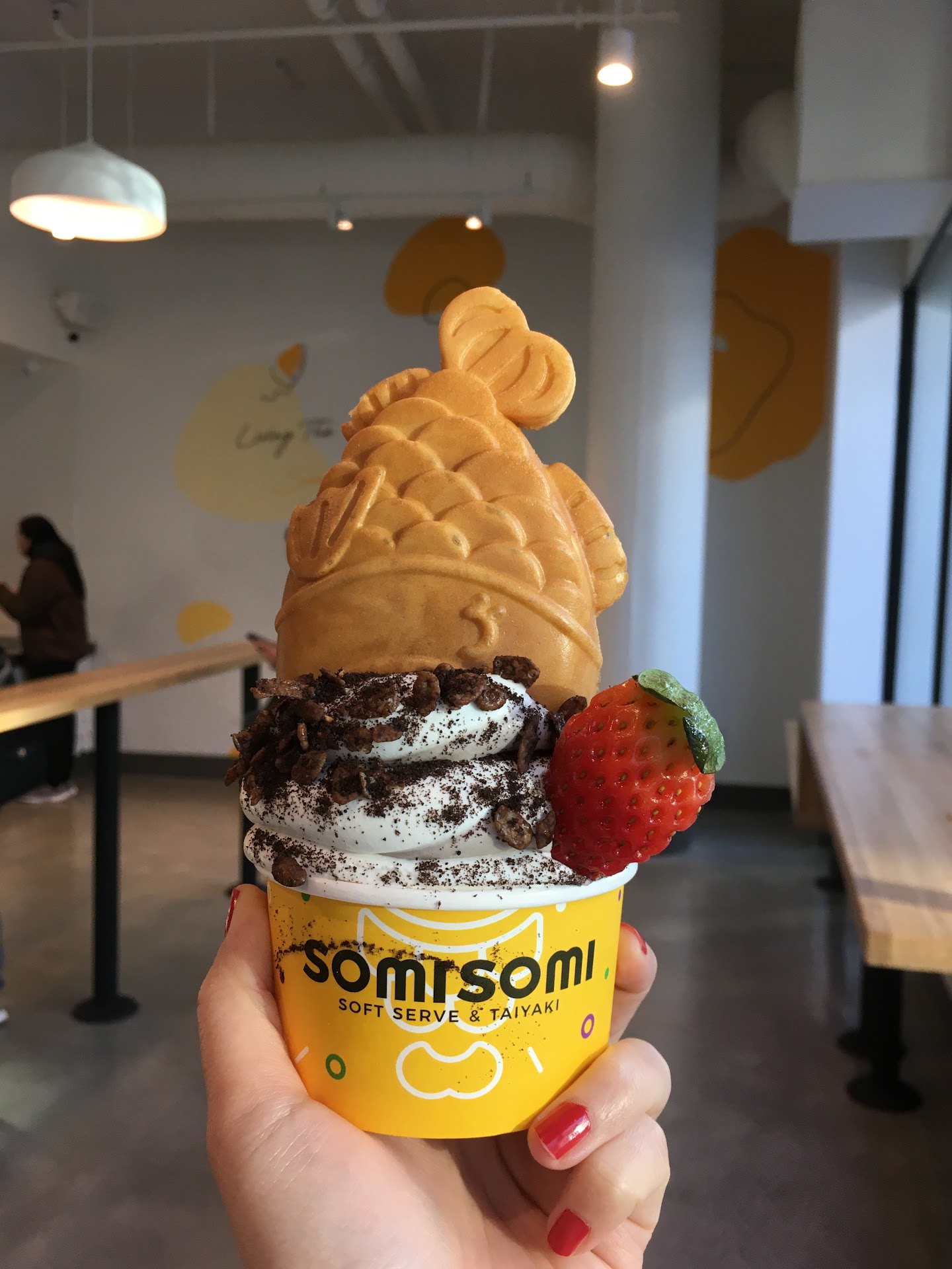 I got cup of ube. Great price at 4.95. It was a great amount of ice cream and you can add any toppings you want. They also ask you if you want a macaron or a strawberry on top. The ube tasted more sweet than anything, didn’t have much of an Ube flavor. My husband got cookies and cream and that was also a very delicate flavor but you can taste more of the cookies and cream flavor I thought than the ube. It’s cool you can get a cone on top of the ice cream, that’s what my husband did. But I wanted to try the hot fish waffle things. I never tried them! So good, served super hot, and choice of filling. It was crunchy on outside and gooey on inside. I got custard and taro filling. I liked the custard filling more.