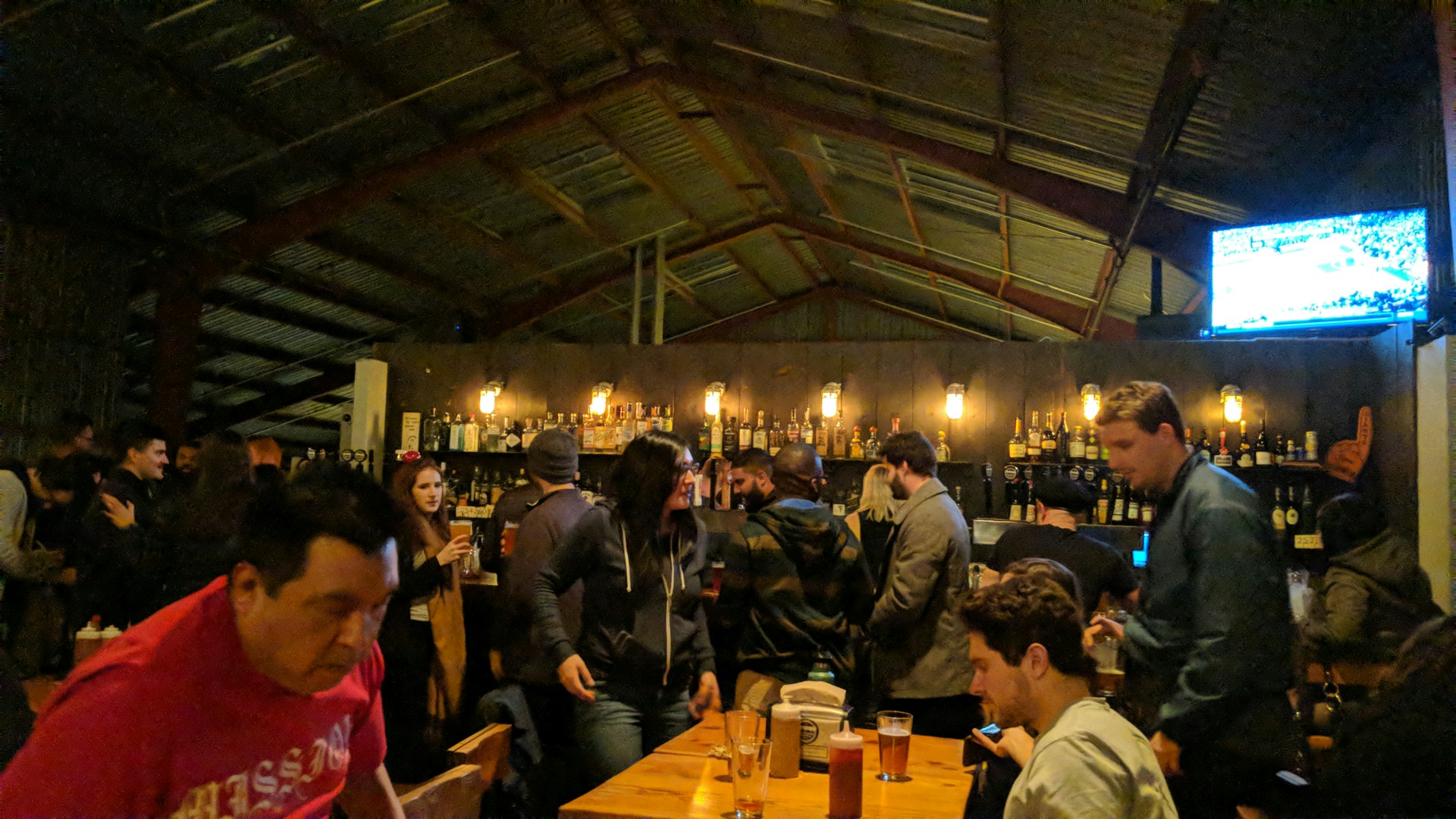 We worked our way through the crowd and made our way to the 2nd level. As all of the seats both up and down appeared to be occupied, we were lucky to have found a seat at a table with a nice couple of newlyweds from KY, who were visiting SF on their honeymoon and somehow found this place on obscure Treat Avenue, as they were staying at an Airbnb located around the corner. I thought that the Southern Pacific craft beer was tasty. We tried a Weizen brau, with a flavor highly reminiscent of limes. I really liked that citrus flavor, as I have been known to add squeezed limes to other beers. However, this SPBC Weizen wasn't my friend's favorite beer taste experience.