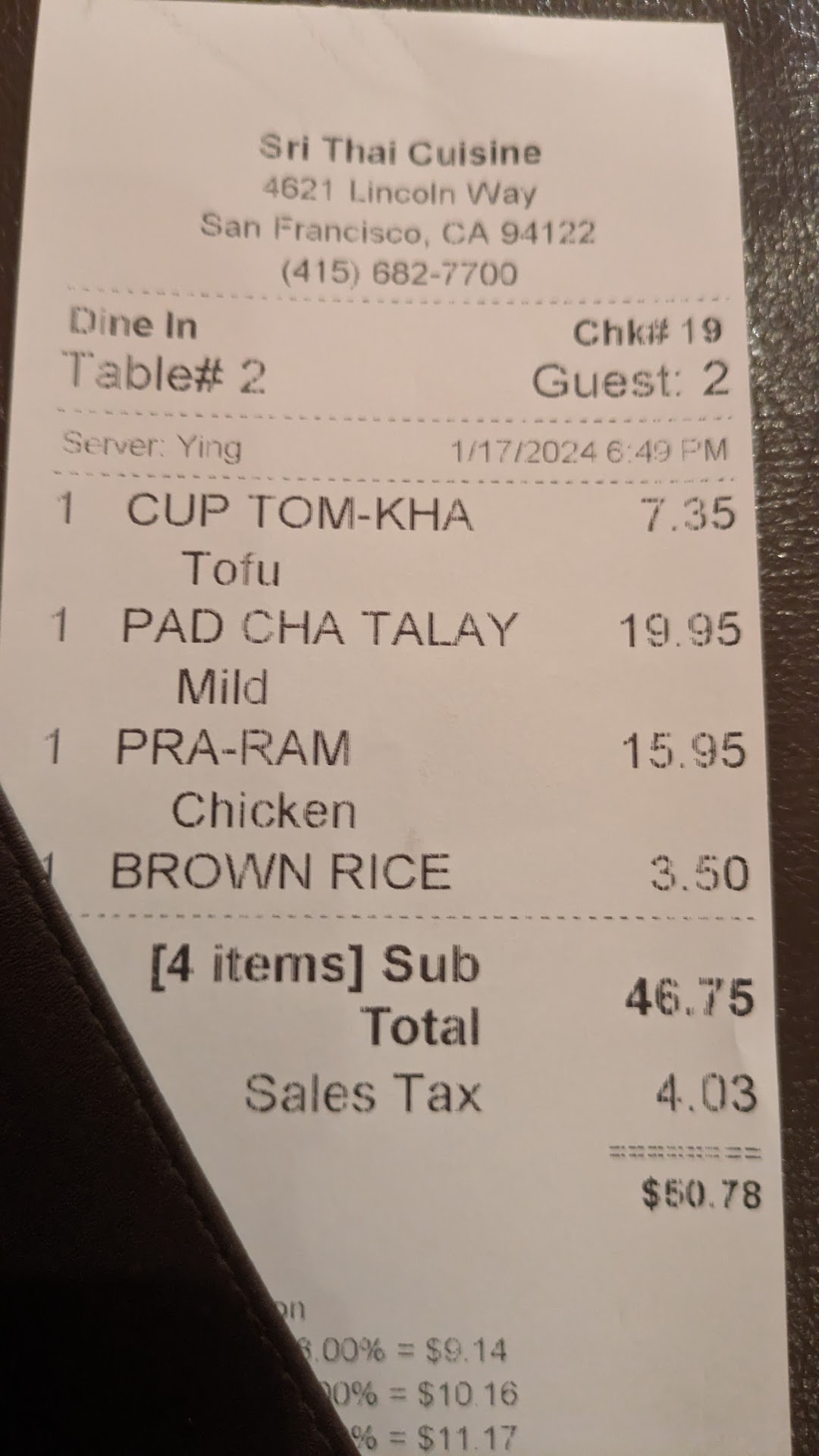 Read moreThe Best Thai Ever! First time and impresed with Sri Thai. The food is just amazing and service beyond expectations. We had an aptizer pluz 3 entress. Had to decide which one was the best. We are vegans and gluten free. Our server Aroon did a fantastic job answering all the questions and placing the order the way we wanted. Very friendly and professional giving such a plus to the whole experience. My girlfriend is a professional chef accomplished in culinary arts from different regions of the world. We have a very special relationship with food and diet not just taste but energy coming from it. This review is to acknowledge the level of this restaurant serving the best to the comunity. Thank you so much Sri Thai to be there on our...