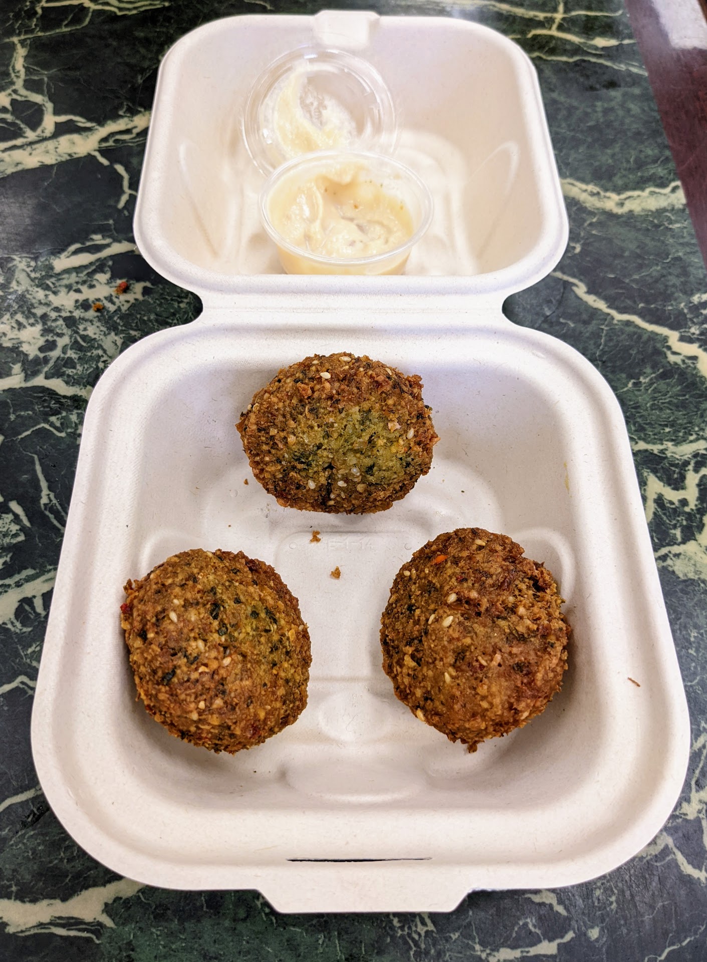 Read moreBest falafel in town no lie and I'll tell you why. Crispy outside, moist and soft inside, pop of flavor from solid base and spices/herbs used, and fresh because they constantly make falafel. That is the star of this restaurant but for meat eaters kibbeh and kufta are my go to. I recommend trying the dips and salads see if they adhere to your taste. Pretty standard recipes they do. A nice addition to make a nourishing meal. I like spicy food so I always like some home made shata, a middle eastern hot sauce. Finally, dessert can be classic baklava or their no added sugar date cookie! So good with a little less guilt. They also make s cookie or gharaba that delicately melts...