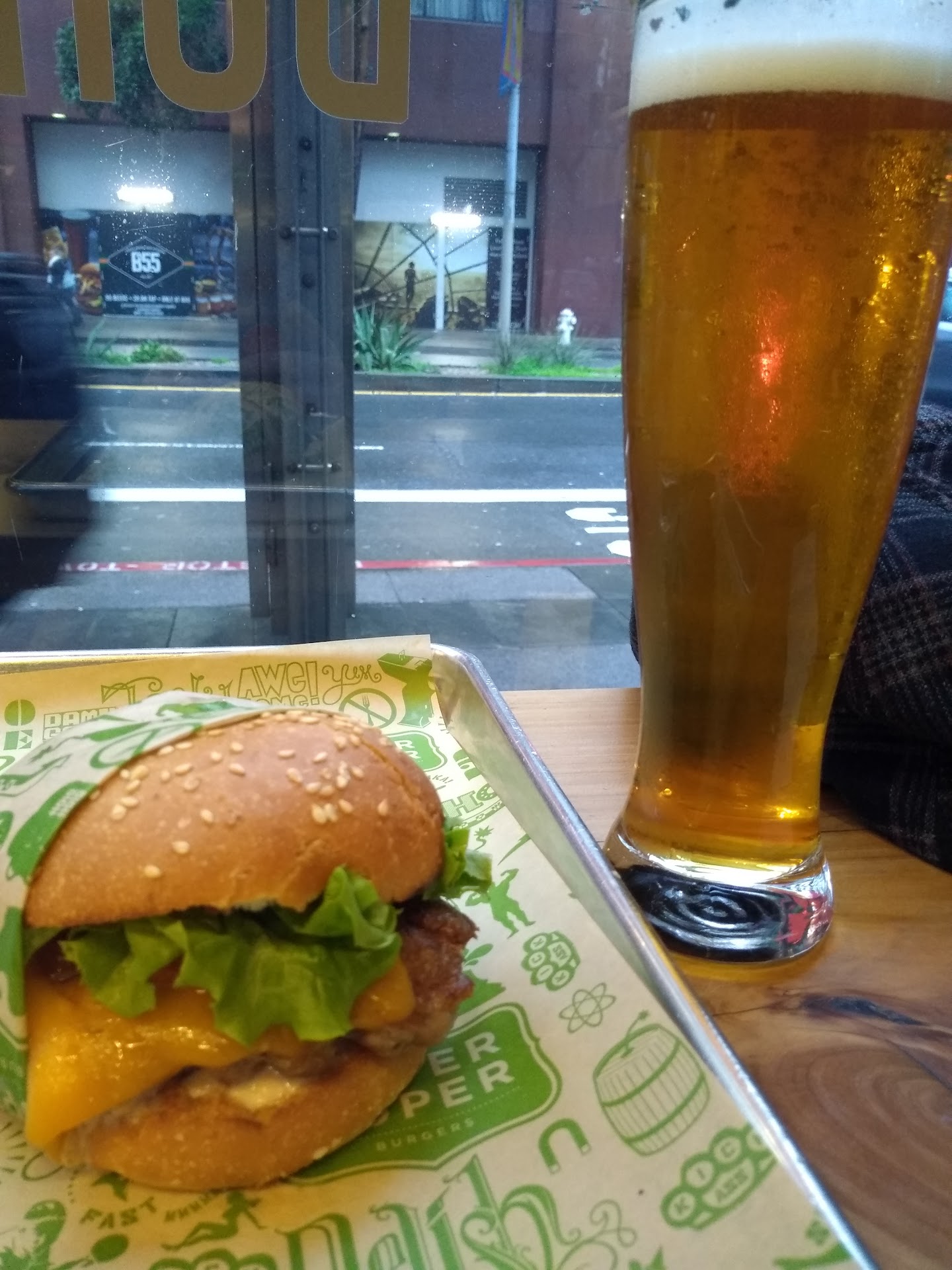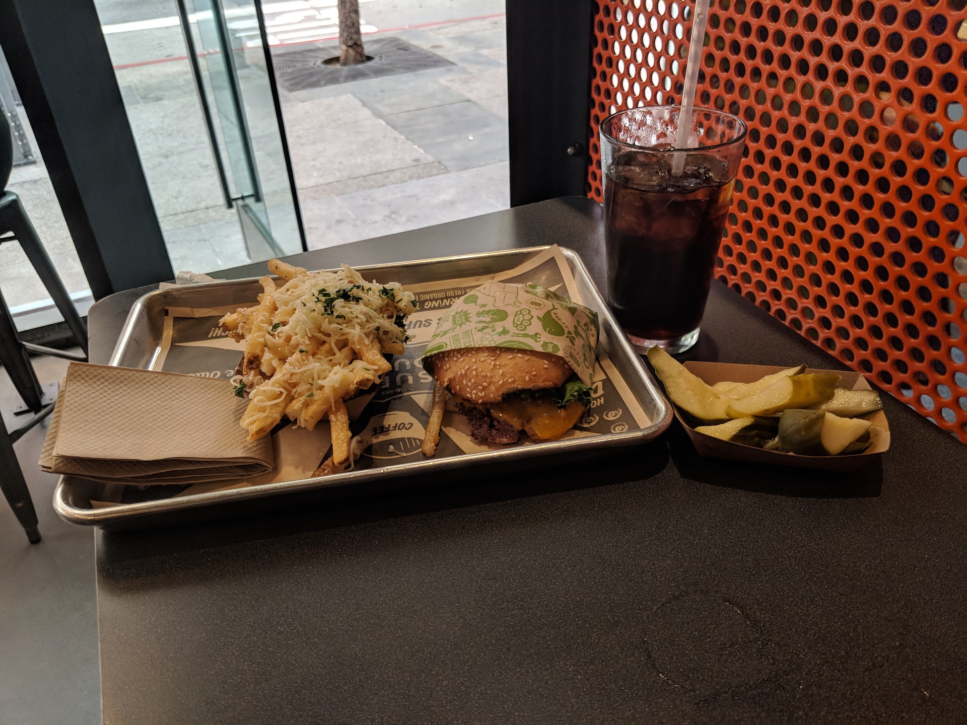 After seeing Spider-Man no way home My friend and I were definitely hungry, there were a lot of places inside of the metreon but I had never been to a super duper Burger so we decided to go there. From the metreon elevator exit for AMC, we just went outside and turned the corner and it was essentially right there. There was a bit of a line for people who were ordering for takeout so my friend and I decided it would be a good idea for us to just sit down and order. When you sit down. There's a QR code on each table for you to order and the food will be called out for you. Each table has a number, but my friend and I found that once you pay on your phone and it sees the name on your credit card, your actual name will be called from the front. You have to go and pick up your food, and since we are in those lovely pandemic times, we also had to both show that we were vaccinated. Please remember to bring your vaccination card or at least a picture that every single location you go to in the city, just keep it in whatever bag you're about to use. Because I saw more than one group of people who had at least one friend who forgot their vaccination card, or simply we're not vaccinated. It really ruins the day when you have to go home because your plans weren't thought through for everyone in the group. Anyway, the food at this location was amazing, I got one of their burgers with hard cheddar and an egg and it was absolutely delicious. Their fries are extremely crisp, didn't even taste too salty. They also have homemade pickles in a jar for you to get as many as you want. They were a little sour for my taste, but still very good, and super crunchy. They also serve glass cups for people who are indoor eating, which I was not prepared for. But you can always ask for a straw if you are still feeling a little iffy about glass...
