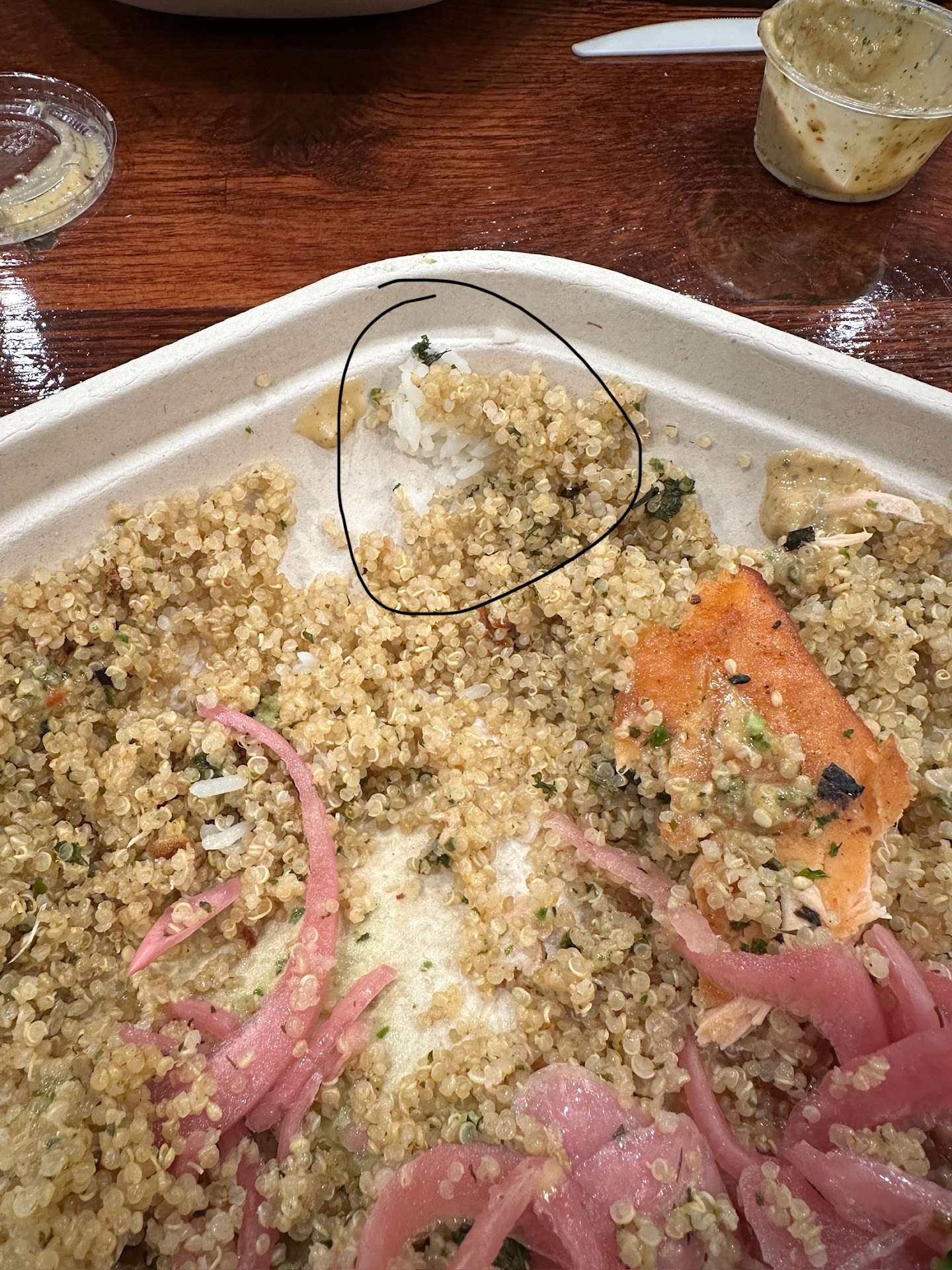 The situation escalated when a female employee, possibly of Indian descent, intervened. Initially, she corrected the misinformation by confirming the availability of the miso glazed salmon. However, the service did not improve from there. She assumed our choice of rice without inquiry, and upon our request for quinoa, she carelessly mixed it with the remaining white rice in our bowl - a clear disregard for food hygiene and customer preference.