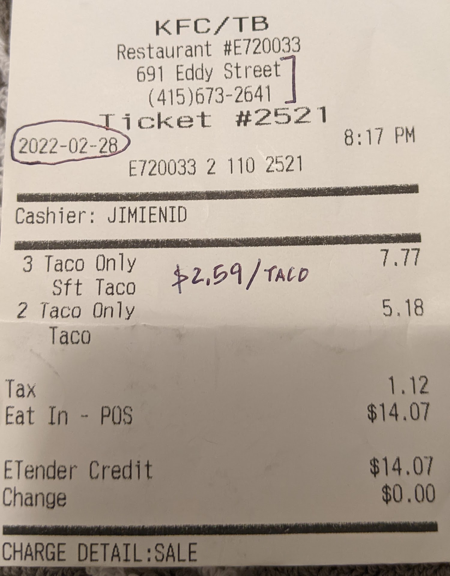Read moreI've lived in the building I'm in, across the street from this KFC/Taco Bell location, for 3 year's now and have been a regular customer of theirs. My last visit there I had a couple of problems with the person that took my order and the last one ended up being that he rang me up for something different than I ordered so when I noticed it of course I took it back, although I'm disabled and it's hard for me to get out when I have to, I stated my dissatisfaction to the manager about what happened and when my anger was deescalating the security guard got in my face so I told him to leave me alone and stay out of it yet he decided to run his mouth and tell me he was going to continue to stand there, escalating the problem again. When I left he actually followed me out of the establishment continuing to run his mouth so I contacted corporate and complained yet the only thing the manager did was tell that security guard to let him handle the situation next time and for said security guard to not get involved and offered to replace my order. After going through what I did I'm not sure that I even want to go back in...