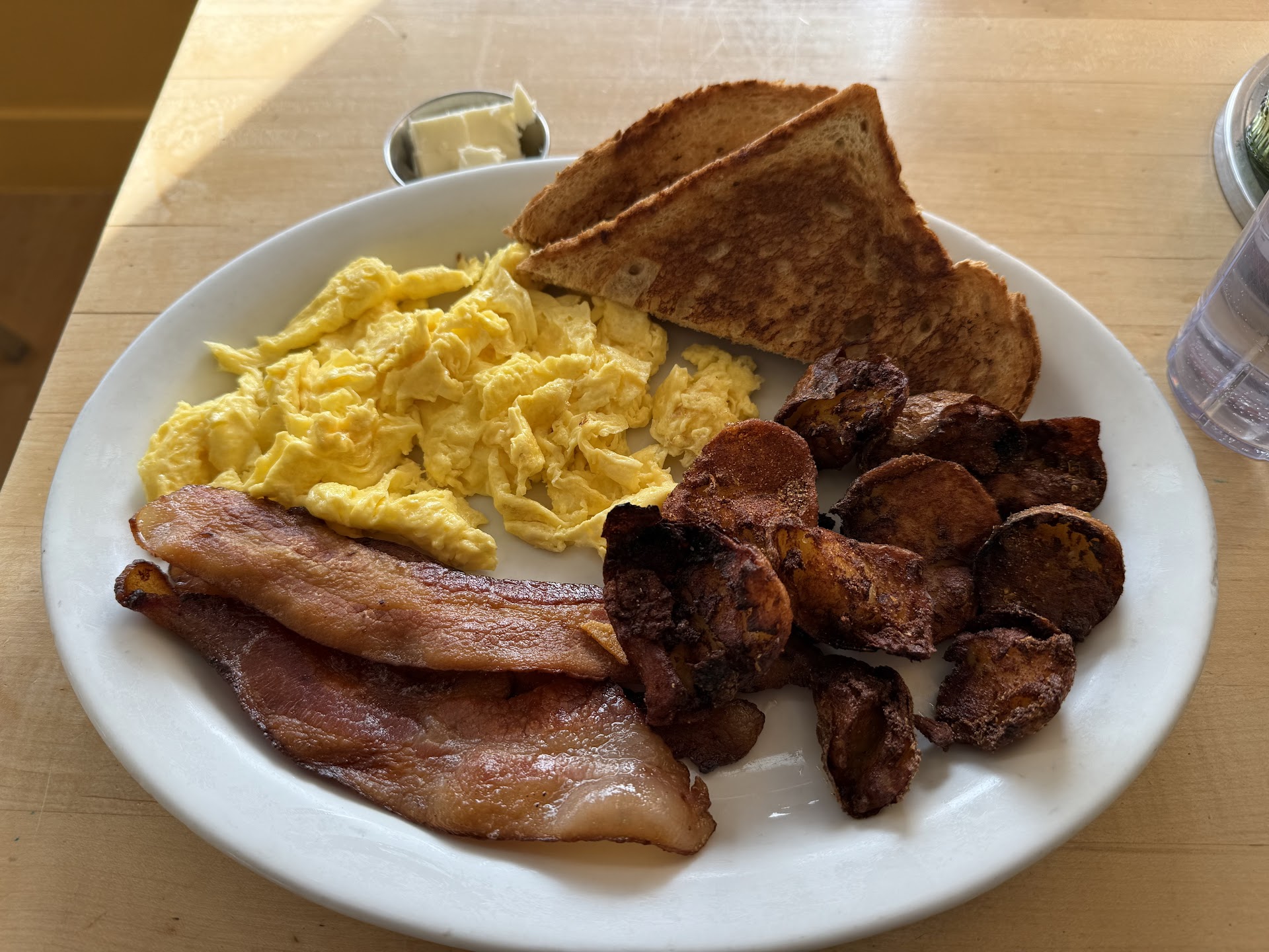 Read moreThis is a very cute corner breakfast spot in a nice neighborhood. I like supporting new, small businesses, especially when the owners are so nice & pleasant. Food has been good every time I’ve been here. Had the brioche French toast first time I was here and it was great. Today I opted for a lighter, more traditional breakfast and it did not disappoint! Eggs cooked well and thick cut bacon was crispy. The smashed breakfast potatoes were crunchy on the outside, smooth on the inside and seasoned perfectly. The also have salt water taffy on the bar because one of the...