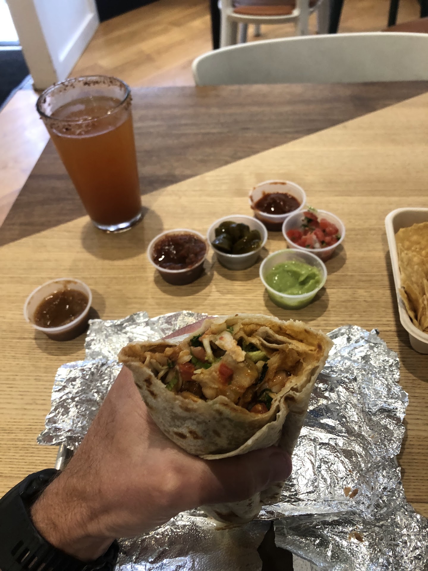 Nachos are generous, with choice of beans (tip - get refried on the side or whole beans to keep the chips crunchier). Burritos are normal size, but the meat is gristle free. Excellent salsas at the serve-yourself salsa bar -- tomatillo and chipotle were my faves -- complement the best chips north of Market. Even the horchata was richer in flavor and substance.