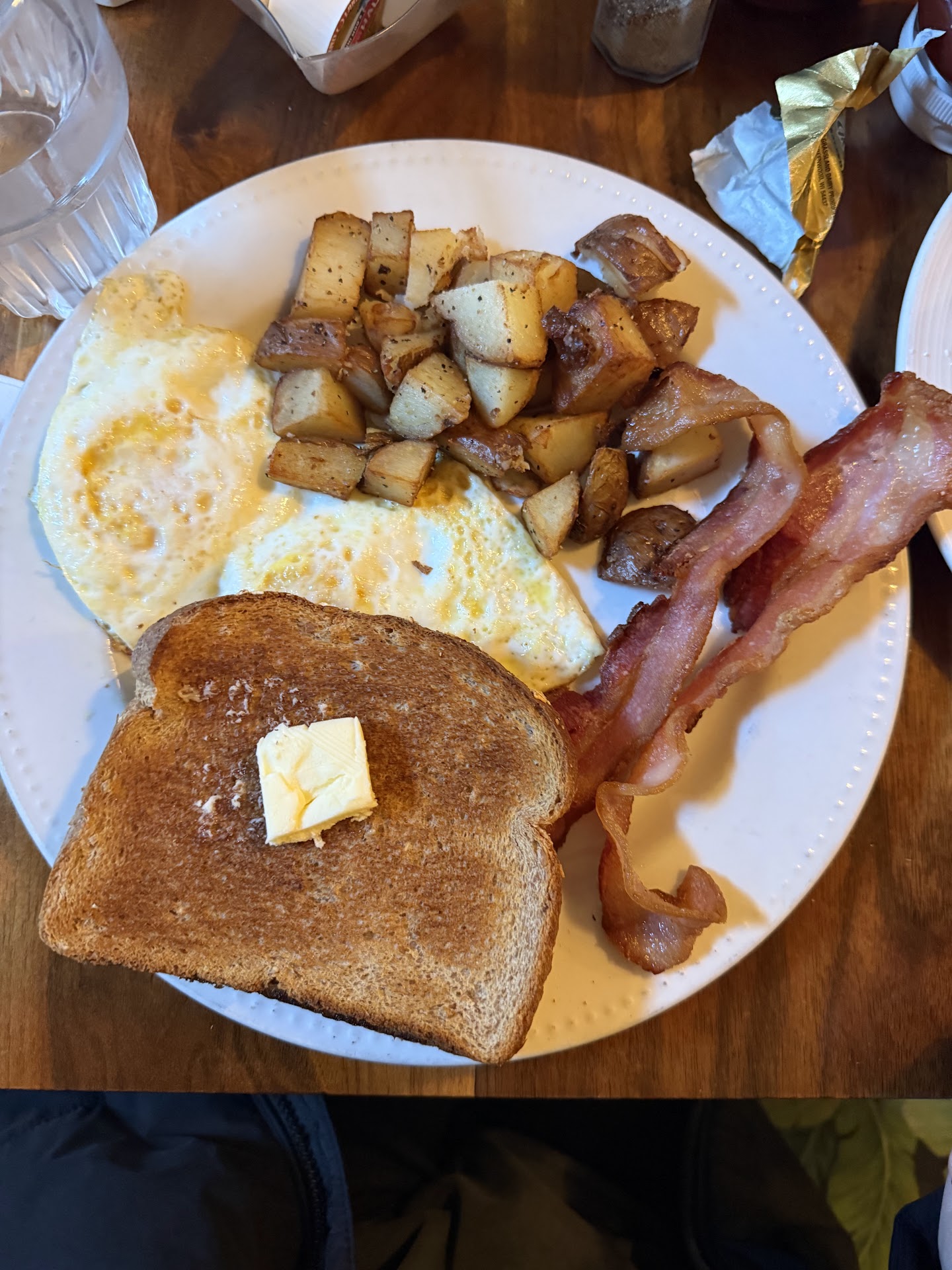 Upon returning to my hotel I was able to actually enjoy the quality which this café serves. Bacon was surprisingly thick and crispy. Blueberry pancakes were made with fresh, perfectly ripe blueberries and offered a pleasing portion. The syrup was almost like honey in consistency and glazed everything it touched. My eggs were a little rubbery but with scrambled eggs, it’s easy to slightly overcook them. The side of fruit was so so as most of the selection (melons) are currently out of season.