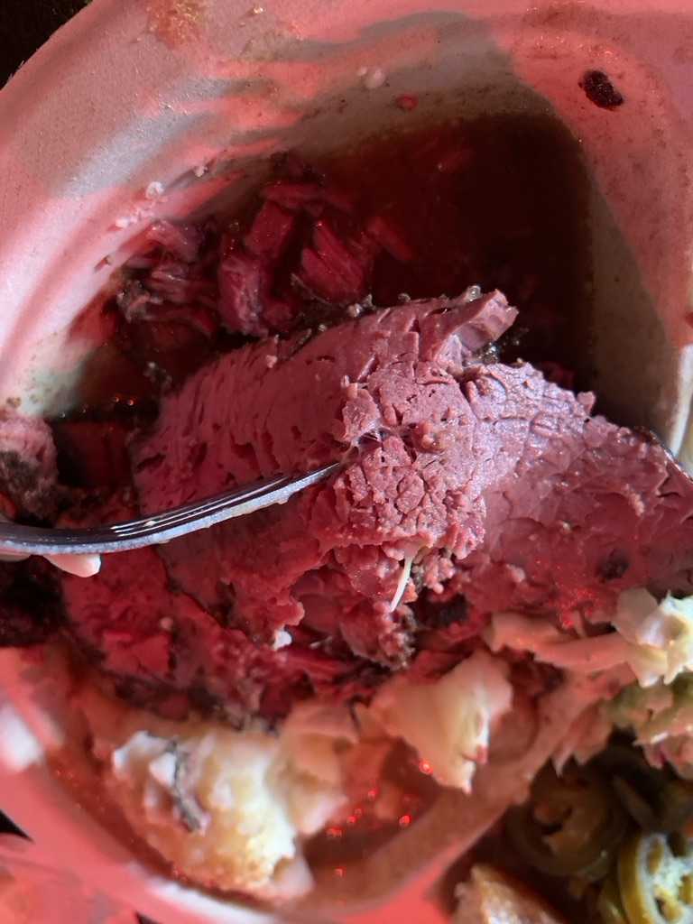 I got a big container with the meat and sides. The mashed potatoes had a weird smell that prevented me from eating more than a couple of bites. The beans felt that they had been sitting for a long time but were edible unlike the mashed potatoes. The pastrami was decent but it was a little too lean and lacked the thick bark that adds to its overall flavor. Overall this was just about passable.