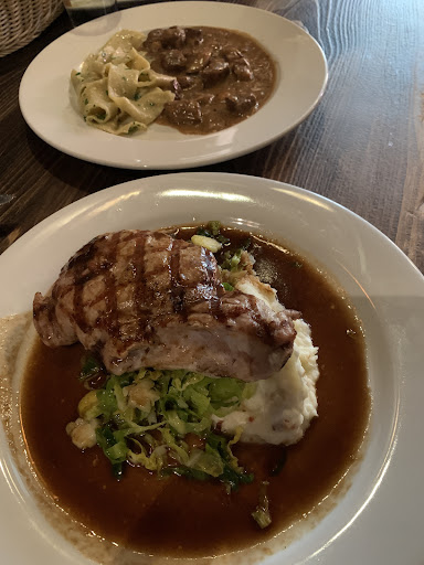 We ordered the meatballs and wedge salad, beef stroganoff and pork chop, and a strawberry short cake and chocolate pot de creme. The food came shortly after. The salad and meatballs were good. The beef stroganoff was really good, but the pork chop was sadly tough and dry. The dessert came and I was really looking forward to the strawberry shortcake but enjoyed the chocolate pot de creme a lot more.
