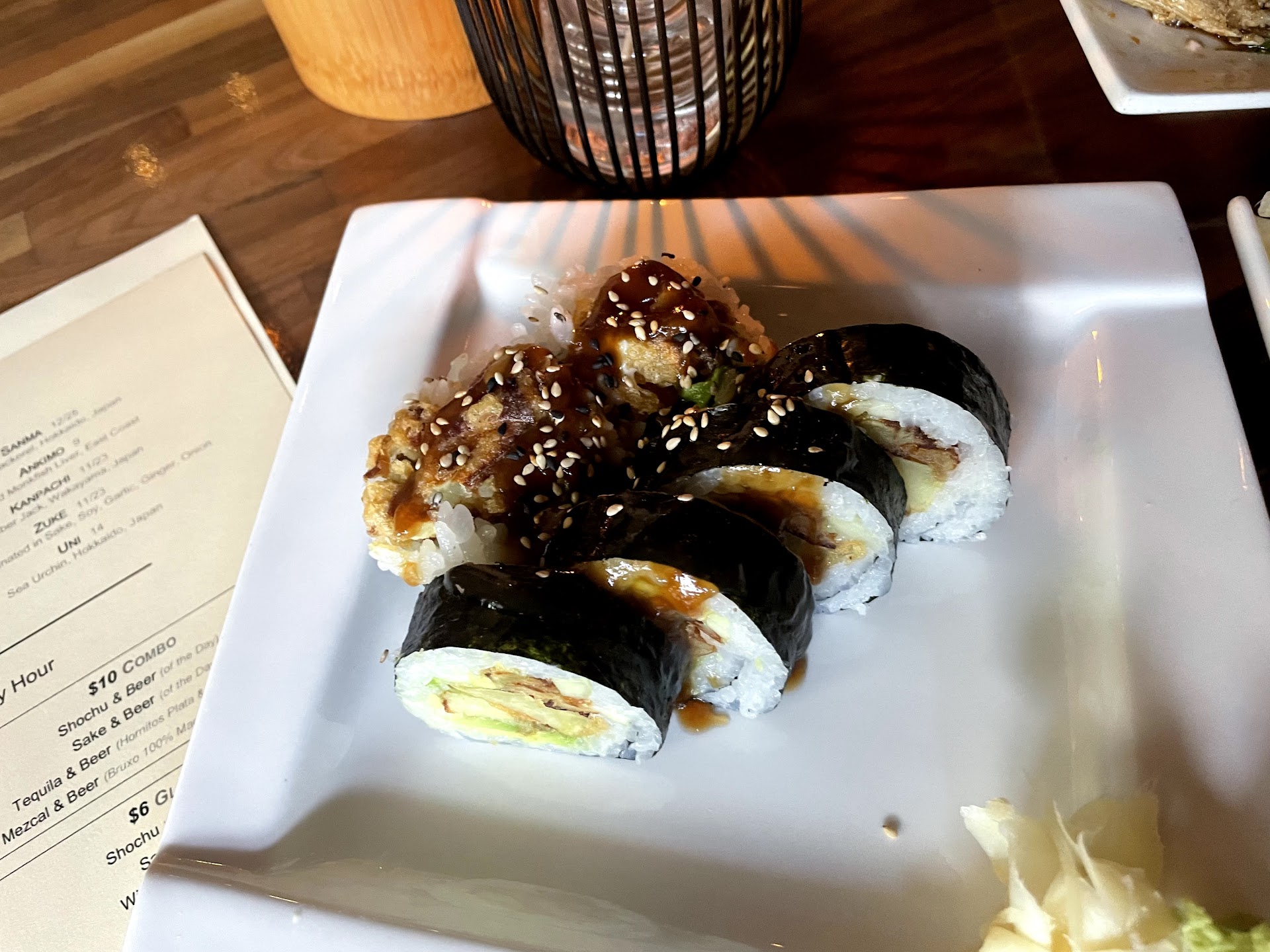 Read moreI wish I had checked this place out sooner--it's terrific! Aside from the extensive and impressive collection of sakes, shochus, whiskeys, and cocktails, the food here is top notch. The rolls are so creative and intriguing it was hard to pick just one, and the one we ended up trying, the Black Sabbath, was excellent. Definitely have to come back and try more. We loved the Torch My Belly appetizer, a heavenly serving of seared salmon belly paired with a savory salad, and the hamachi kama was pretty good, though not the best we have had. The shining star for me was the sushi. We ordered the chu toro nigiri, and this was the runaway favorite not just because it's an obviously fatty and delightful cut of fish. The rice was a level above the best sushi places in the area, with the perfect amount, texture, and flavor. I could order that rice with even the lowliest selection of fish and and still cry with happiness. Can't wait to explore the rest...